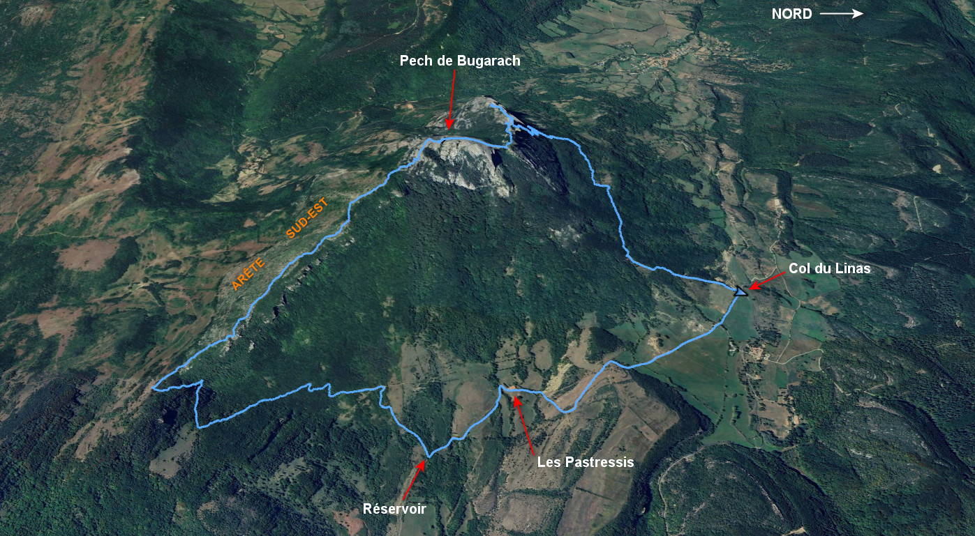 Du Col du Linas, laisser l’itinéraire de la voie normale pour prendre la piste partant au sud-est (piste de gauche quand on rentre sur le parking). Suivre la piste sur 300 m environ puis tourner à droite. Cette piste conduit au point nommé Pastressis, habitation, où lui fait suite la route goudronnée d'accès, la suivre jusqu’à un réservoir. Prendre alors sur la droite pour suivre le « SENTIER CATHARE NORD » sur piste dans un premier temps puis sur sentier. Il rejoint la crête un peu au-dessus du Col de Péchines. Obliquer à droite pour suivre la crête facile jusqu’au pied du sommet. Ensuite plusieurs passages sont équipés de mains courantes (câbles) et un passage avec une corde. Les difficultés sont faibles, PD / II, le rocher offre de bonnes prises ainsi que les racines. L’accès au sommet se fait en rejoignant l’itinéraire passant par la fenêtre.