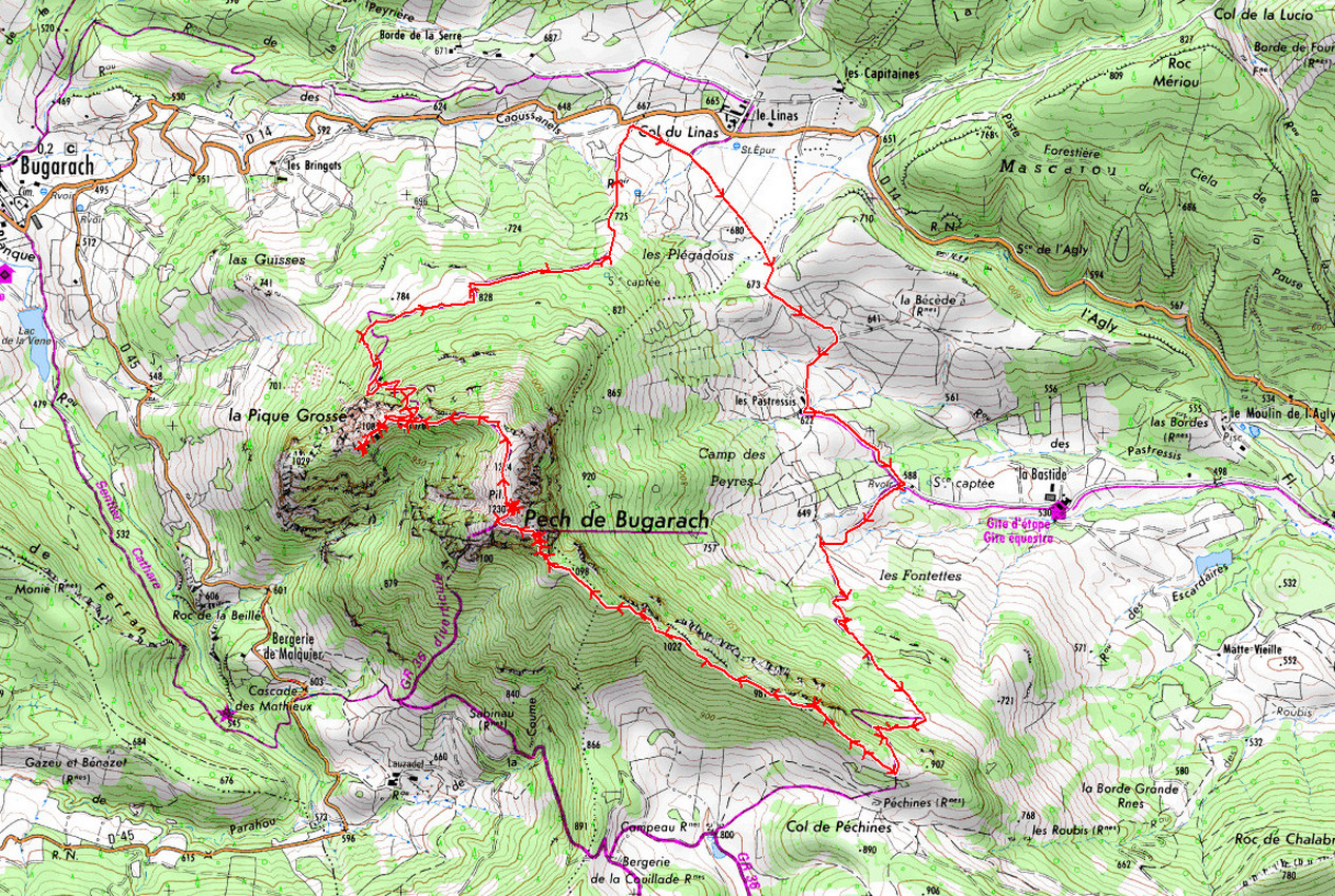 Col du Linas 670 m - Les Pastressis 622 m - Réservoir 588 m - Arête sud-est 910 m - Pech de Bugarach 1230 m - Col 1064 m - Col du Linas 670 m