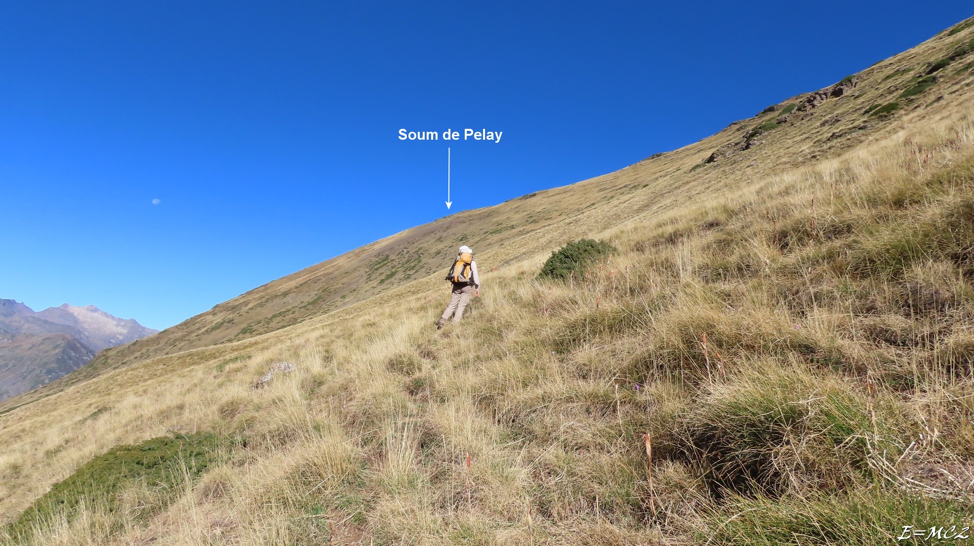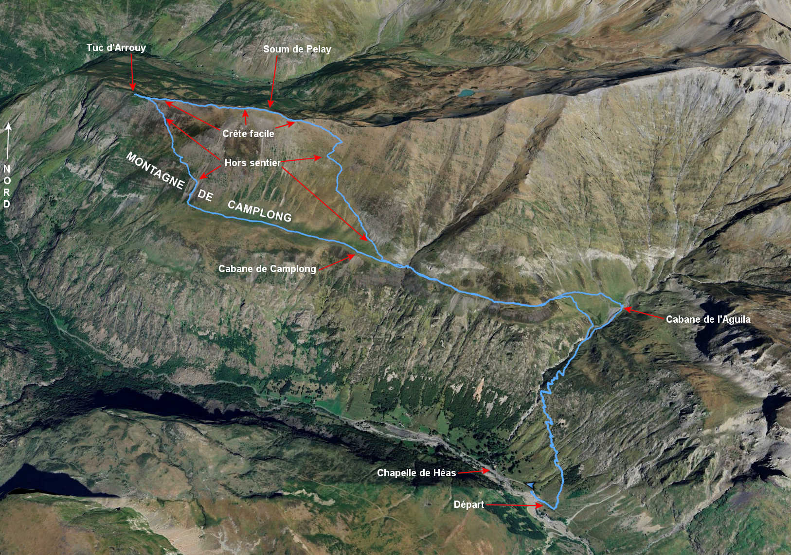Du parking peu après la Chapelle de Héas, prendre la direction de la cabane de l’Aguila. Sans atteindre la cabane, vers 1880 m, obliquer sur la gauche, traverser le ruisseau de l’Aguila et monter de 80 m au nord pour récupérer le sentier de la cabane de Camplong. À l’approche de la cabane, laisser celle-ci sur la gauche pour commencer à monter progressivement en faisant une très longue traversée vers le Soum de Pelay. Il faut louvoyer au mieux du terrain, passer de sentes en sentes qui apparaissent et disparaissent régulièrement. La pente est soutenue mais ne présente pas de réelle difficulté. Sur la fin de la montée vers la crête, on peut gagner de l’altitude plus directement vers le point coté 2410 m et rejoindre une bonne sente faisant la jonction avec la crête peu avant le Soum de Pelay. Poursuivre sur la crête vers le Tuc d’Arrouy.