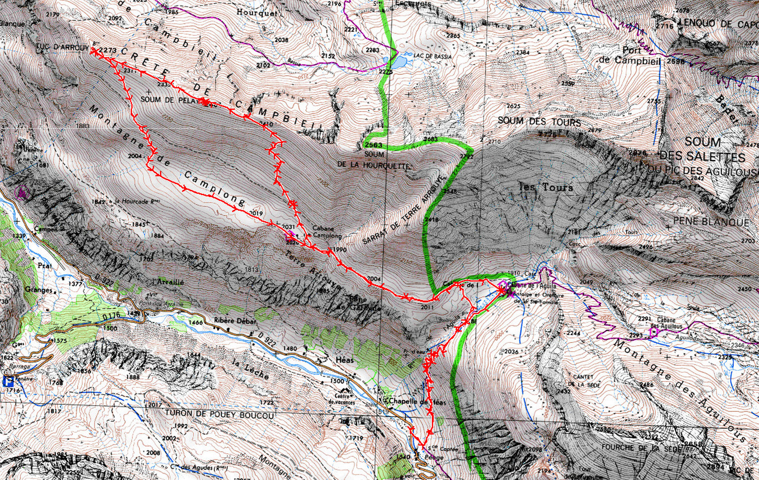 Chapelle de Héas 1530 m - Passerelle 1890 m - Cabane de Camplong 2026 m - Soum de Pelay 2404 m - Tuc d'Arrouy 2273 m - Plateau de Camplong 1890 m - Cabane de Camplong 2026 m -