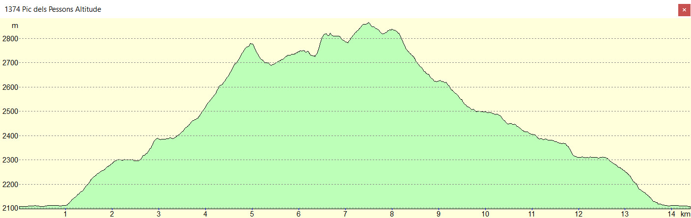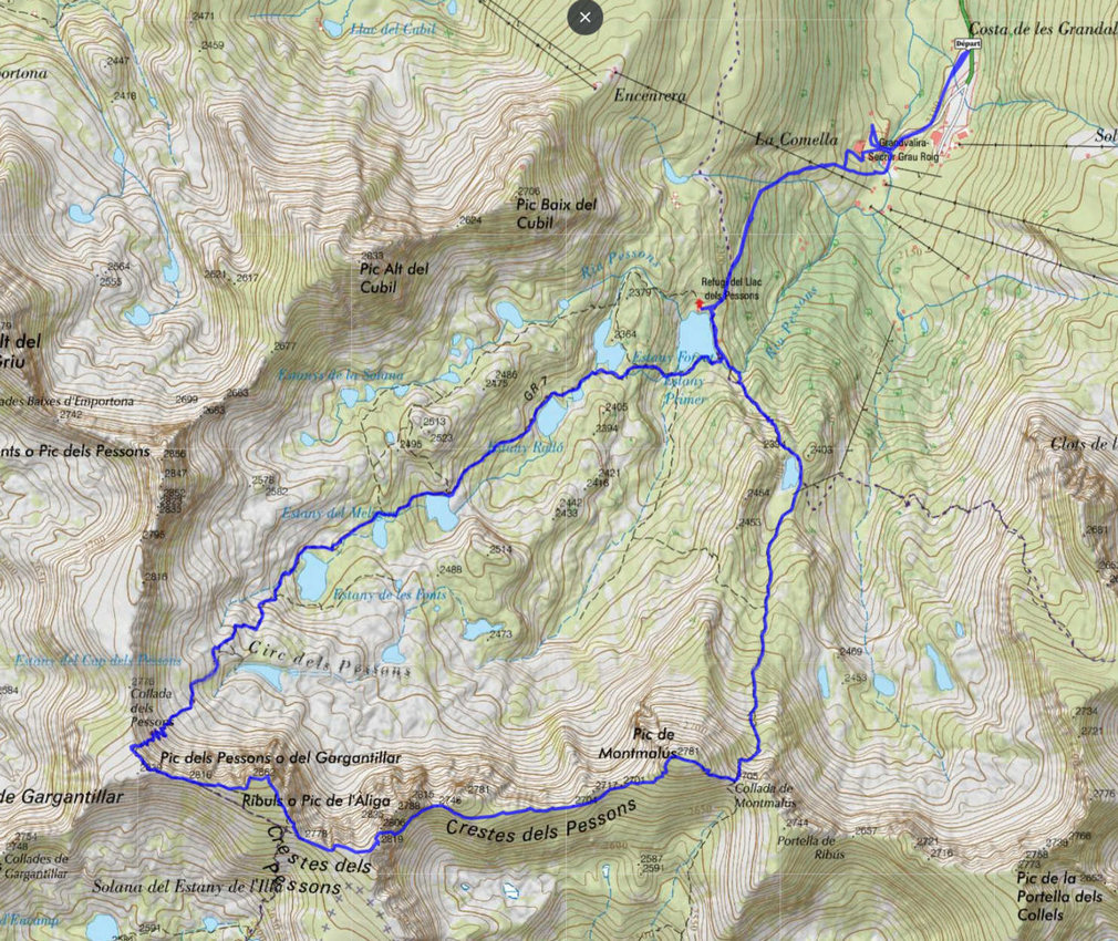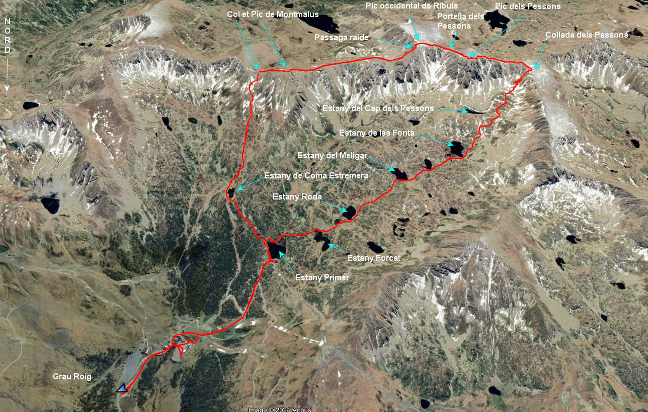 Grau Roig 2100 m - Estany Primer 2300 m - Estany de Coma Estremera 2390 m - Collada de Montmalus 2705 m - Pic de Montmalus 2781 m - Pas de Ribuls 2746 m - Pic occidental de Ribuls 2819 m -