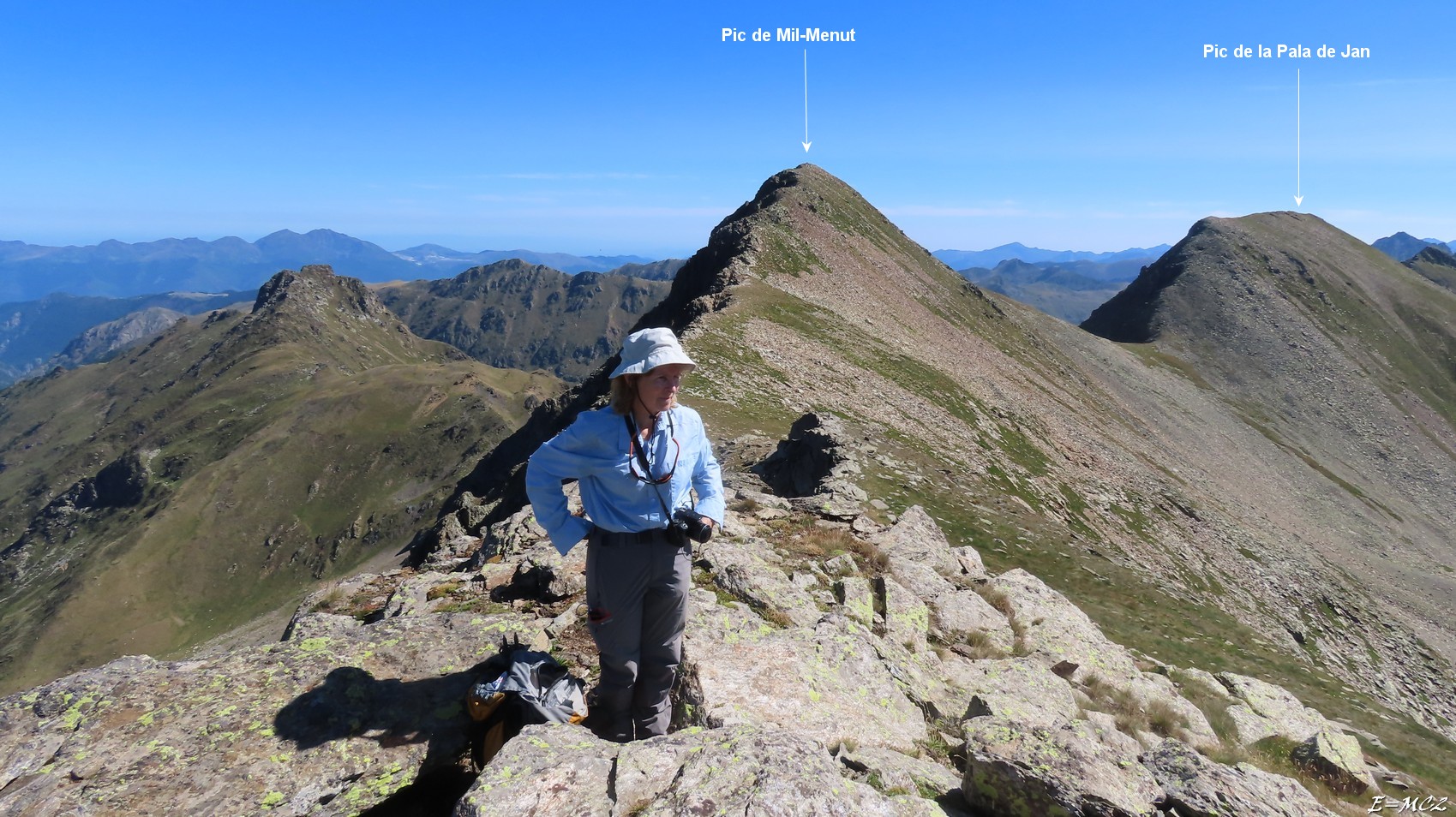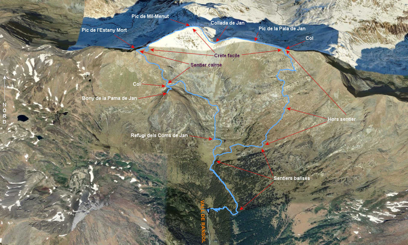 Du Pic de l’Estany Mort, suivre la crête frontière en traversant les Pic de Mil-Menut et le Pic de la Pala de Jan (non nommé sur la carte IGN). Du Pic de la Pala de Jan, conserver la crête jusqu’à la première dépression et descendre sur la droite. Il faut louvoyer au mieux du terrain pour revenir progressivement vers le refugi de Jan. On peut rejoindre un sentier balisé rouge jaune, le suivre vers la droite et reprendre le sentier utilisé à la montée sans passer par le refuge en coupant sur la gauche.
