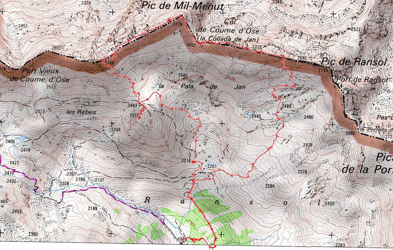 Collada de Jan 2651 m - Pic de la Pala de Jan 2776 m - Col 2700 m - GRP 2260 m - Sentier 2160 m - Vall de Ransol 1950 m