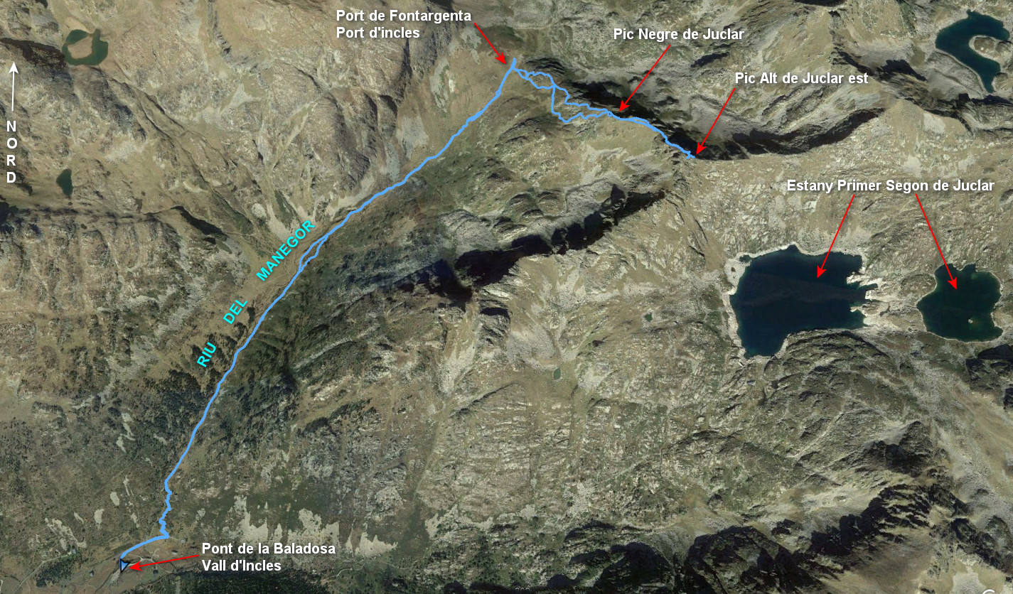 Sortir du parking au terminus de la route du Vall d’Incles en empruntant la passerelle et prendre l’itinéraire du Port d’Incles par le vallon Riu del Manegor. Du Port d’Incles (Port de Fontargenta pour la France) monter sur la droite, par la ligne frontière, au Pic Negre de Juclar. La pente est soutenue mais présente peu de difficulté. Depuis ce sommet, l’accès au Pic Alt de Juclar semble présenter plus de problèmes, après une zone facile il y a deux ressauts à franchir. Le premier se fait en marchant et pour le second quelques pas d’escalade facile (une dizaine de mètres, I+) avant de finir de monter au sommet sans difficulté.