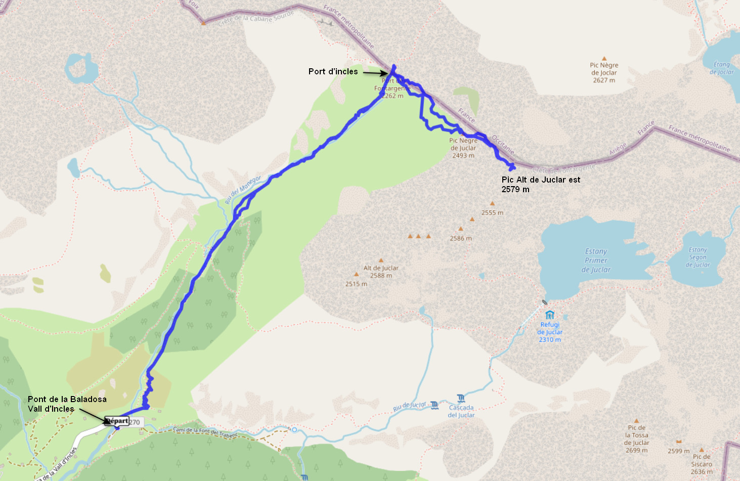 Vall d'Incles 1830 m - Port d'Incles 2262 m - Pic Negre de Juclar 2492 m - Pic Alt de Juclar est 2579 m - Port d'Incles 2262 m - Vall d'Incles 1830 m