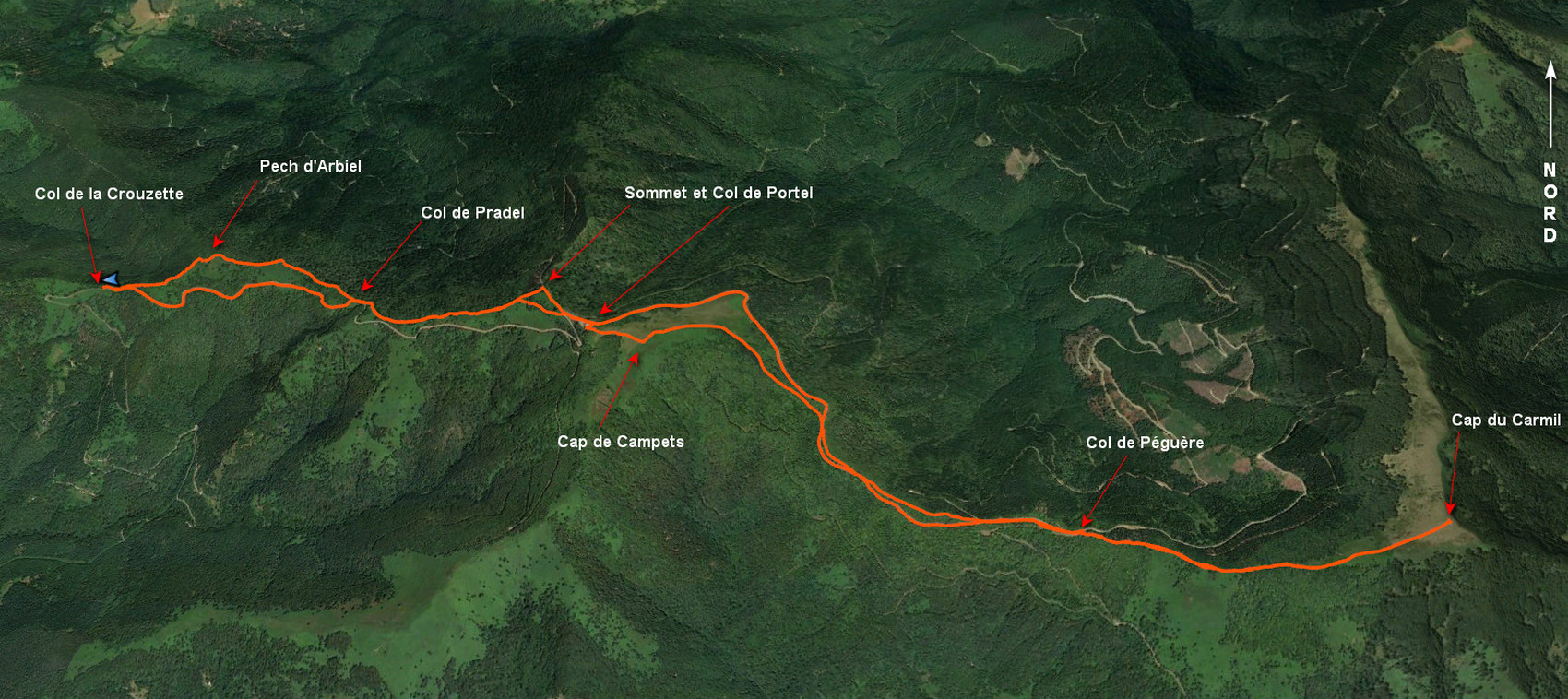 Col de la Crouzette 1241 m - Pech d'Arbiel 1366 m - Col de Pradel 1280 m - Sommet de Portel 1468 m - Col de Portel 1432 m - Cap de Campets 1504 m - Col de Péguère 1375 m -