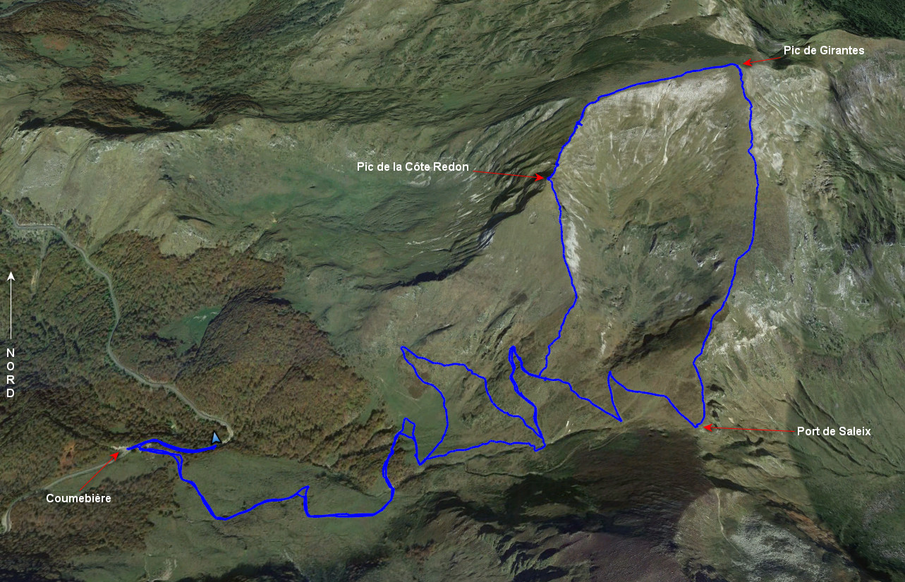 Du Port de Saleix, pour suivre par l’arête sud pour rejoindre Pic de Girantes, sentier du Tours du Pic des Trois Seigneurs. Du sommet descendre à l’ouest jusqu’au point 1975 m et obliquer au sud pour descendre jusqu’au petit col qui précède le Pic de la Côte Redon. Juste avant ce petit col éviter un passage rocheux vertical par la gauche nécessitant quelques pas de désescalade facile. Il reste quelques mètres pour atteindre le Pic de la Côte Redon. De ce pic descendre au mieux hors sentier pour retrouver le GR 10 vers 1700 m et revenir au point de départ.