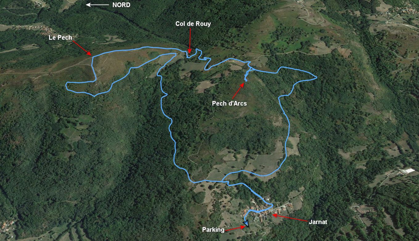 Jarnat 650 m - Le Pech 931 m - Col de Rouy 803 m - Col 890 m - Pech d'Arcs 908 m - Jarnat 650 m
