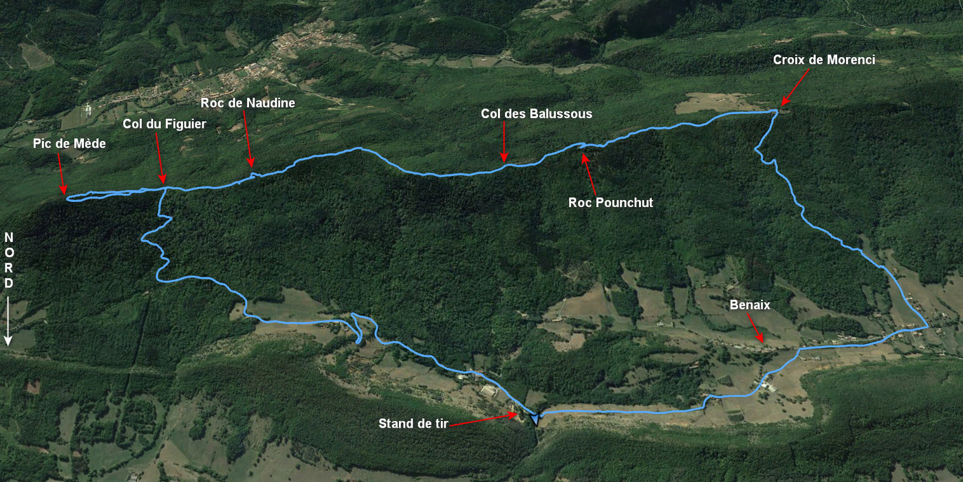 Pas de l'Ecluse 518 m - Rousseaux 535 m - Durenat 648 m - Col du Figuier 830 m - Pic de Mède 907 m - Col du Figuier 830 m - Roc de Naudine 886 m - Col des Balussous 847 m -