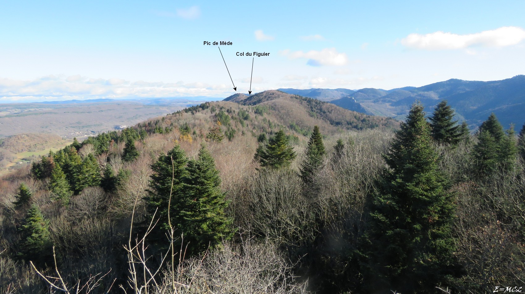 Du « PAS DE L’ECLUSE », continuer sur la route, longer le stand de tir et peu après celui-ci au hameau Rousseaux, laisser sur la droite la route vers Bénaix pour prendre celle de gauche. Après être passé au lieu-dit « LE PAGES », la route passe en piste carrossable au niveau d’un gîte, faire 600 mètres de plus sur la piste et prendre sur la droite, au lieu Durenat, une piste non carrossable montant vers le Col du Figuier. Du Col du Figuier suivre la crête vers la gauche, est, pour monter au Pic de Mède. Il rechercher les meilleurs passages entre les buis. Il y a une borne IGN qui marque le sommet. Du sommet on peut voir en léger contre bas une piste versant nord, non marquée sur la carte IGN, on l’a empruntée en partie pour revenir au Col du Figuier, en la quittant lorsqu’elle oblique sur la droite. Une vague trace permet de rejoindre le col en suivant plus ou moins une courbe de niveau.