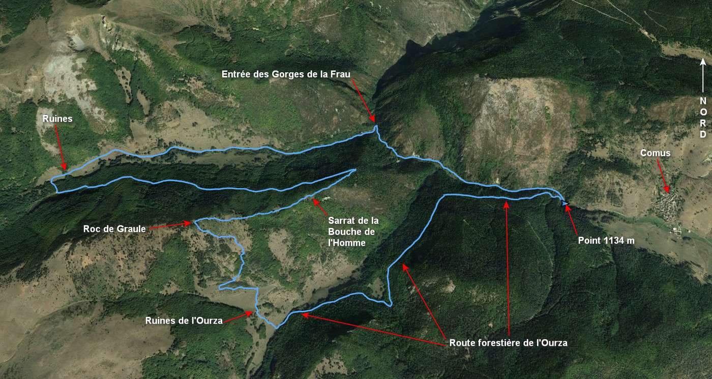 Vallon de l'Hers 1134 m - Gorges de la Frau 1039 m - Ruines 1350 m - Crête 1480 m - Sarrat de la Bouche de l'Homme 1609 m - Roc de Graule 1724 m -