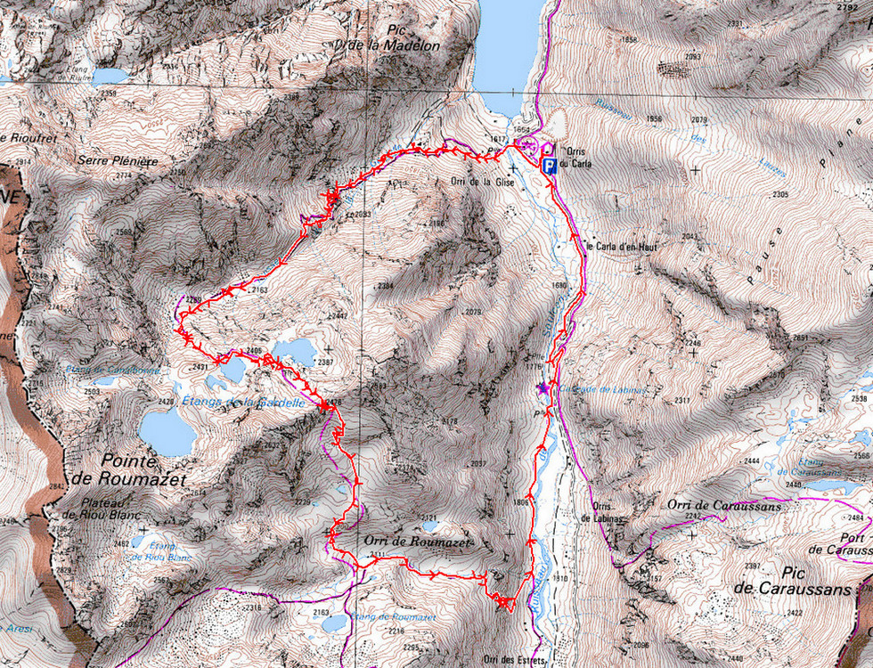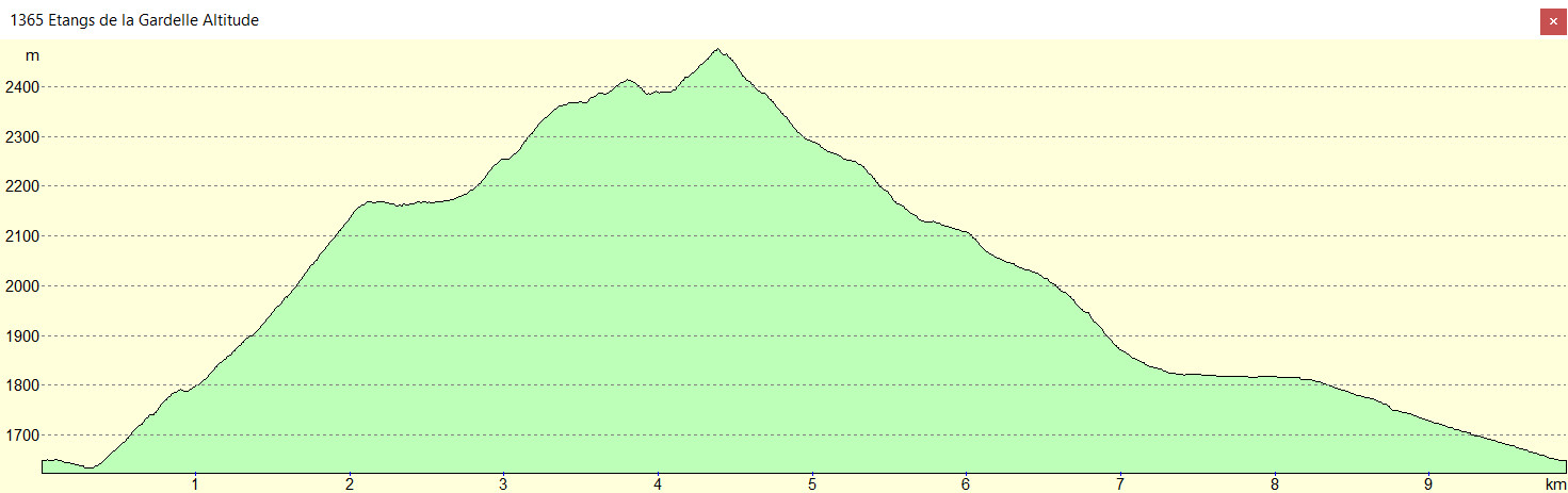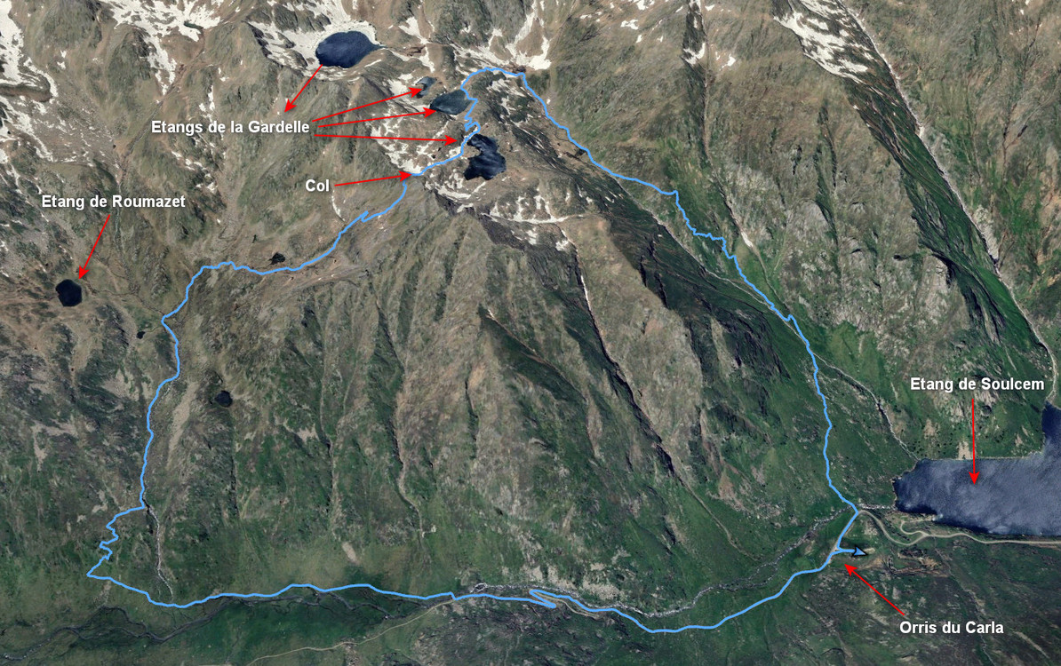 Orris du Carla 1650 m - Orri de la Gardelle 2150 m - Premier Etang de la Gardelle 2380 m - Deuxième Etang de la Gardelle 2387 m - Col 2476 m -