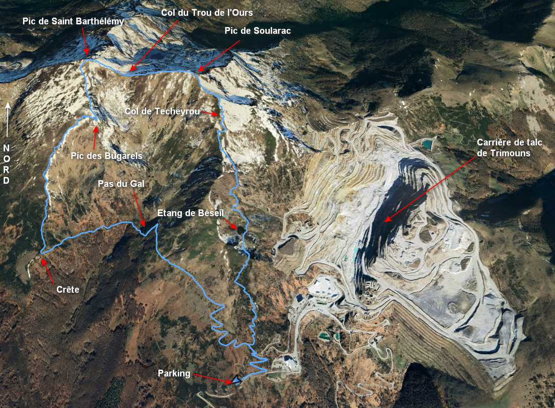 La Lauze 1565 m - Cabane 1760 m - Bifurcation 1741 m - Sarrat de Bertenac 1740 m - Pic des Bugarels 2222 m - Pic de Saint-Barthélemy 2348 m - Col du Trou de l'Ours 2215 m -
