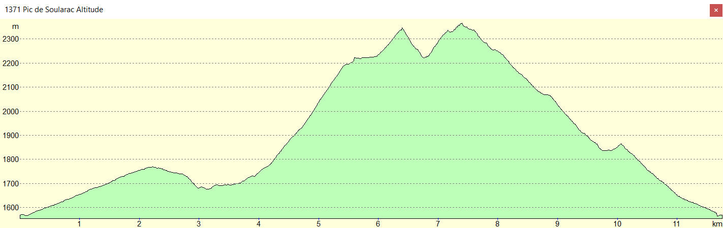 Pic de Soularac 2368 m - Etang de Béseil 1830 m - Col 1860 m - Piste 1630 m - La Lauze 1565 m