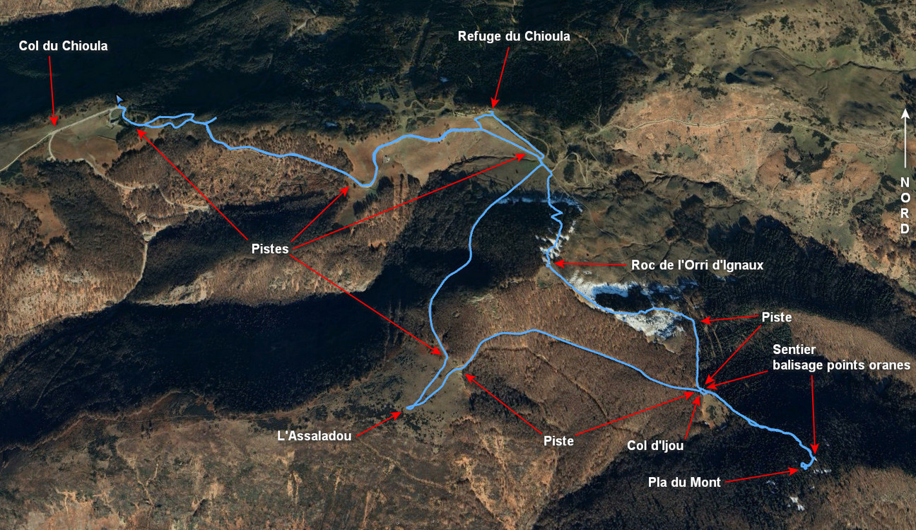 Revenir au Col d’Ijou, poursuivre sur la piste sur 300 mètres environ et tourner à gauche dans un passage de véhicules, monter progressivement jusqu’à la crête la suivre vers la droite par une sente pour finir de monter au Roc de l'Orri d'Ignaux. Du sommet, descendre vers le nord en suivant des traces de passage puis un sentier raquettes. Au Pla de la Garde reprendre la piste pour revenir au point de départ.