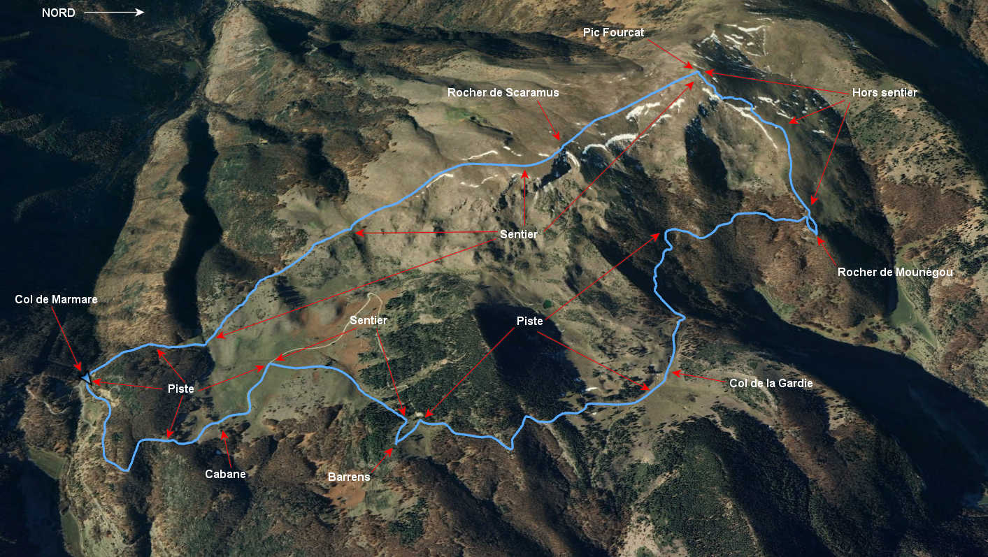 Du col, suivre l’ouest les traces de passage de quad jusqu’à ce qu’elles disparaissent puis continuer hors traces jusqu’au sommet du Pic Fourcat auquel on accède sans difficulté. Du Pic Fourcat descendre au sud-est en longeant la clôture passant par le Rocher de Scaramus. A 1450 m, laisser une piste sur la gauche pour prendre sur la droite un sentier entre le Bois des Courtalasses et le Bois de Freyche Rase. Le suivre jusqu’au point de départ.