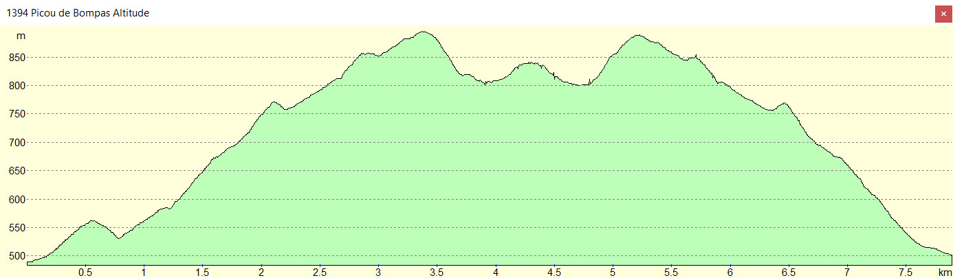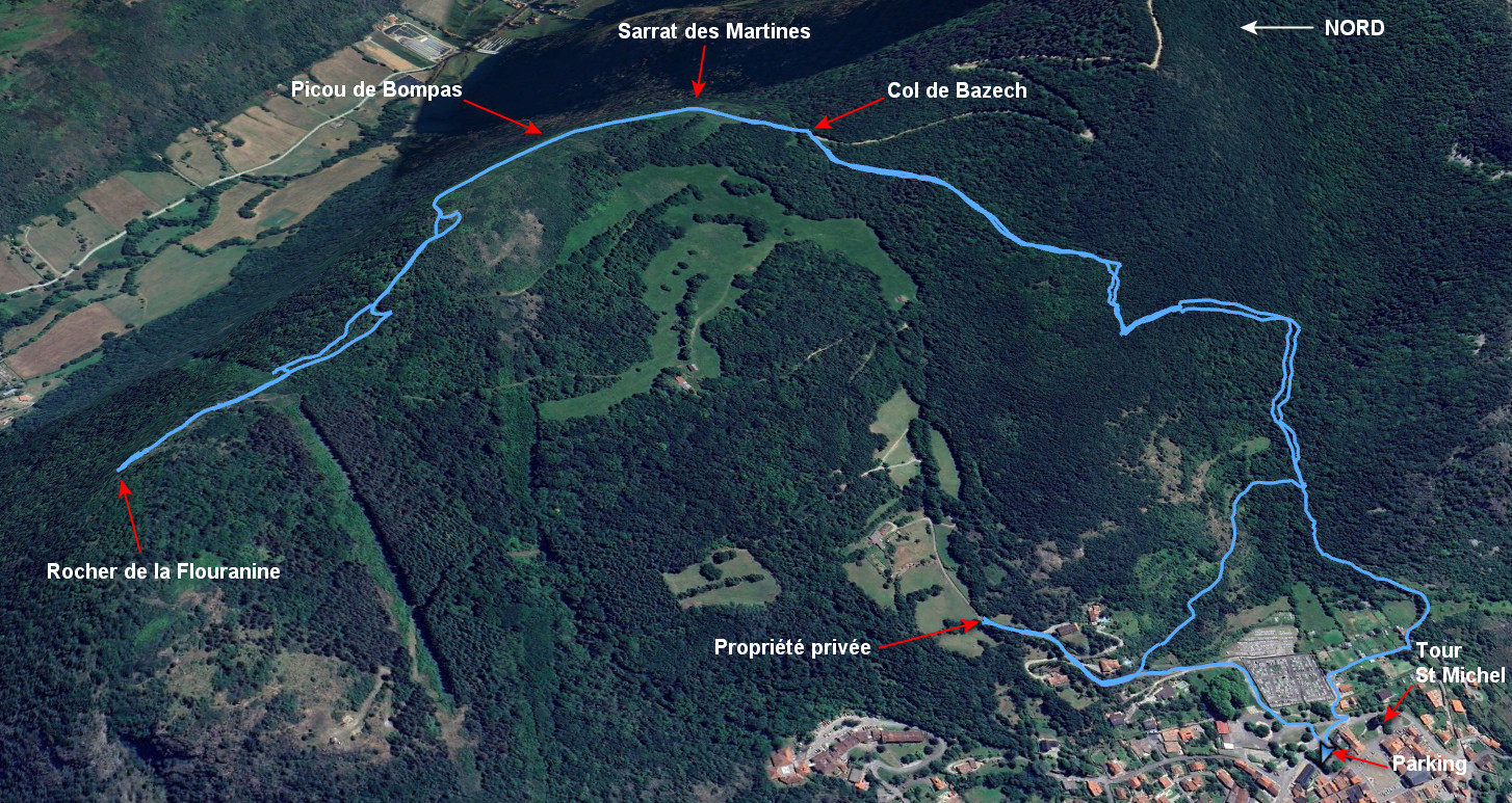 Tarascon-sur-Ariège 490 m - Col de Bazech 810 m - Sarrat des Martines 863 m - Picou de Bompas 900 m - Col 810 m - Rocher de la Flouranine 847 m -