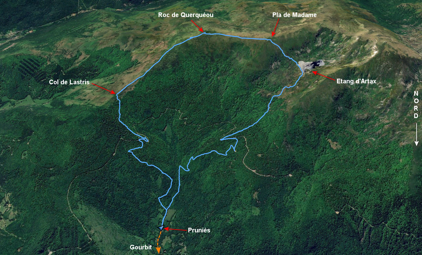 Pruniès 864 m - Etang d'Artax 1695 m - Pla de Madame 1906 m - Roc de Querquéou 1840 m - Col de Lastris 1427 m - Pruniès 864 m