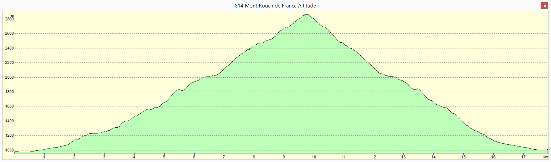 Parking Peyrots 980 m - Cascade de Léziou 1100 m - Cabane Clot Dessus 2023 m - Crête 2397 m - Mont Rouch de France 2868 m - Parking Peyrots 980 m
