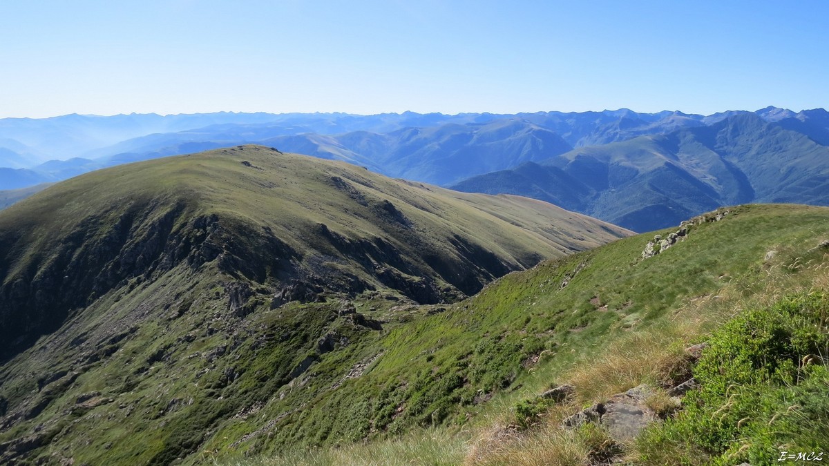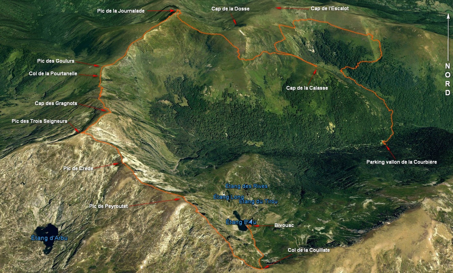 Du Pic de la Journalade il n’y a plus de problème d’itinéraire, il suffit de suivre la crête sans difficulté notable jusqu’au Pic des Trois Seigneurs. De ce pic continuer en direction du Col de la Couillate en passant par le Pic de Crède et le Pic de Peyroutet. Avant d’arriver au col on peut voir sur la gauche l’Etang Bleu où le bivouac sera le bienvenu.