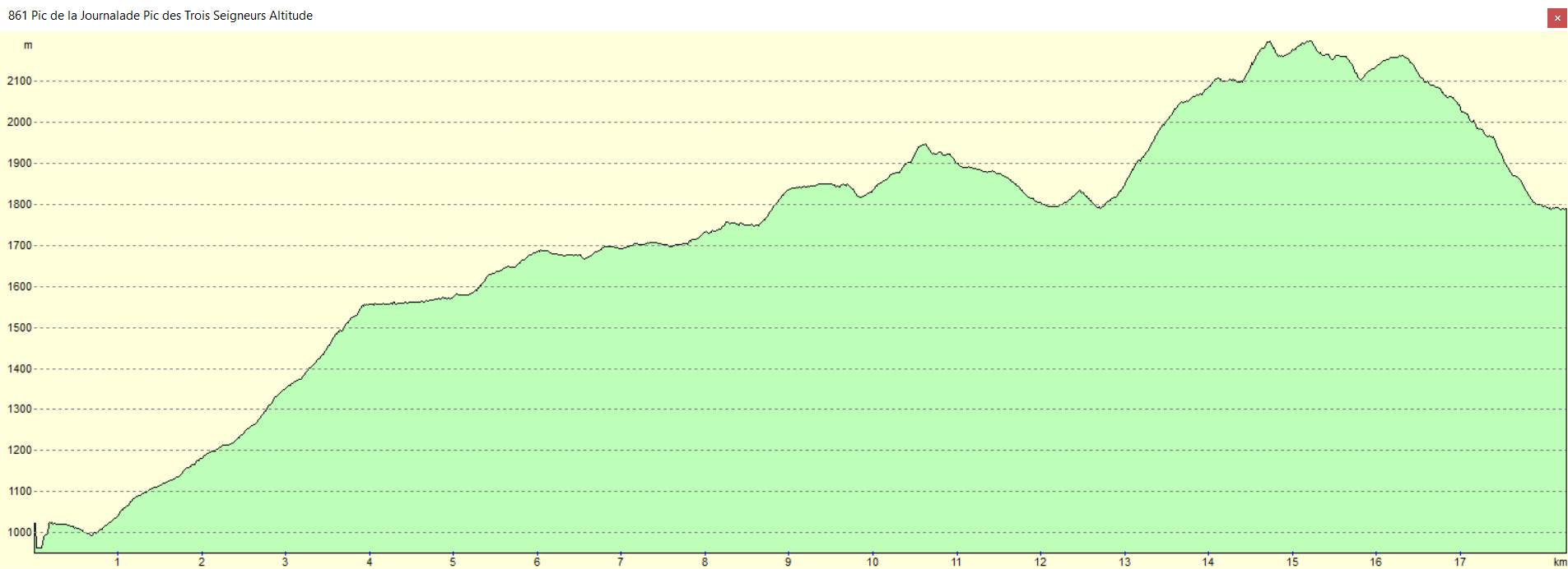 Parking de la Courbière 1022 m - Jasse de Freychinet 1205 m - Cap de la Calasse 1708 m - Col 1822 m - Pic de la Journalade 1945 m - Sommet de Peyre Blanque 1926 m -