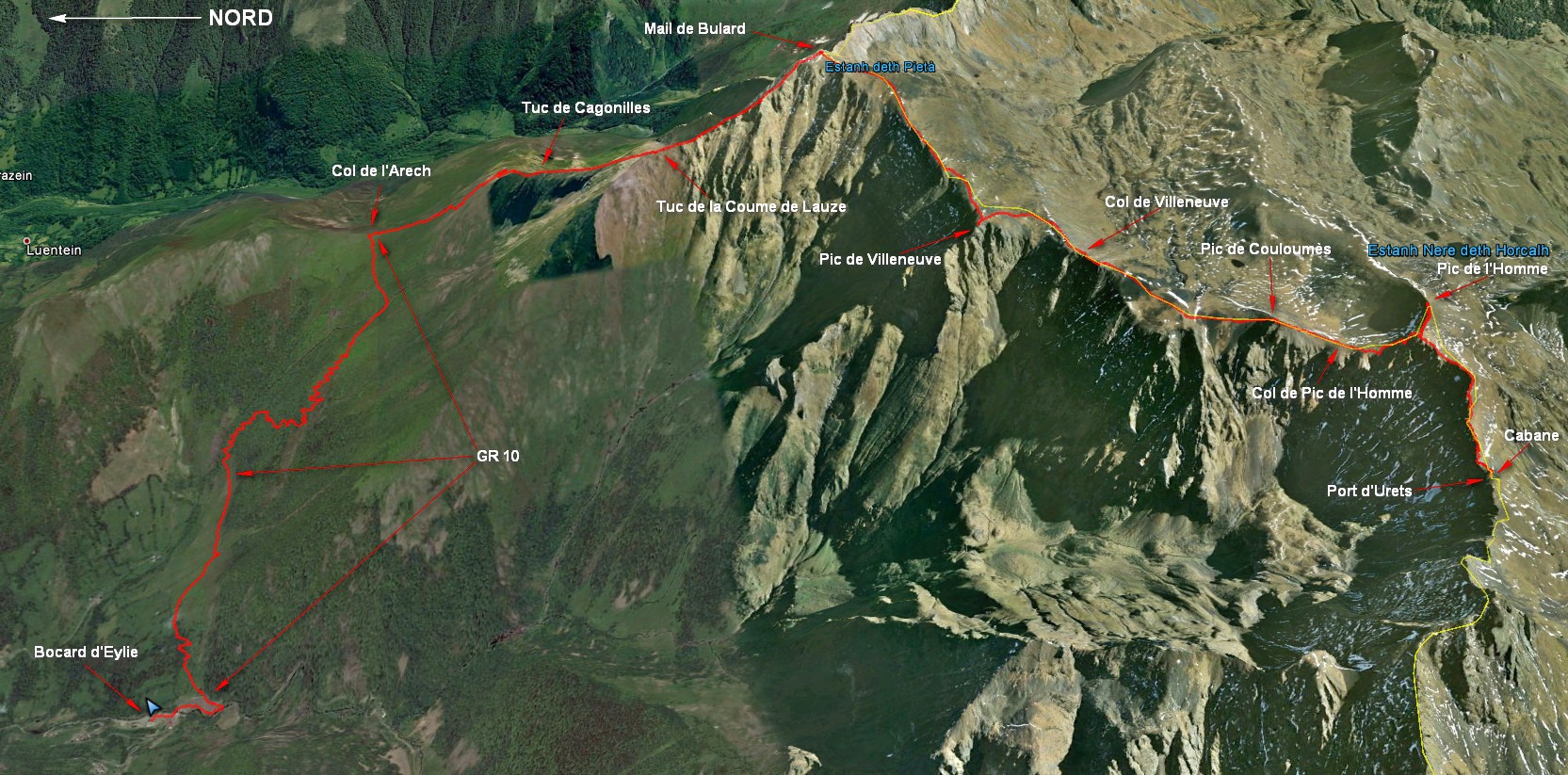 Par contre la descente entre le Mail de Bulard et le Tuc de la Coume de Lauze par l’arête nord, rocheuse, sans être très difficile demande de bien faire attention au cheminement à suivre. Tout en restant au plus près du fil de l’arête naviguer au mieux sur ses deux côtés. Du Tuc de la Coume de Lauze jusqu’au Col de l’Arech la descente devient plus facile. Du col descendre vers l’ouest par le GR 10 jusqu’au Bocard d’Eylie.
