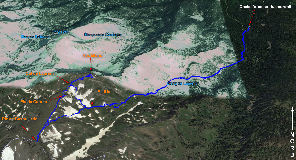 Redescendre au Col de Laurenti remonter le bout d’arête menant au Pic de Canras, pas évident : rester le plus possible sur le fil de l’arête. Contourner un ressaut raide par la gauche et revenir sur l’arête le plus vite possible. La fin est plus facile. Du Pic de Canras continuer plein sud jusqu’au Pic de Baxouillade sans difficulté. Repérer en montant au pic un large couloir peu incliné permettant de rejoindre facilement le petit lac précédant le Col de Laurenti et le chemin de la montée pour un retour par le Lac du Laurenti.