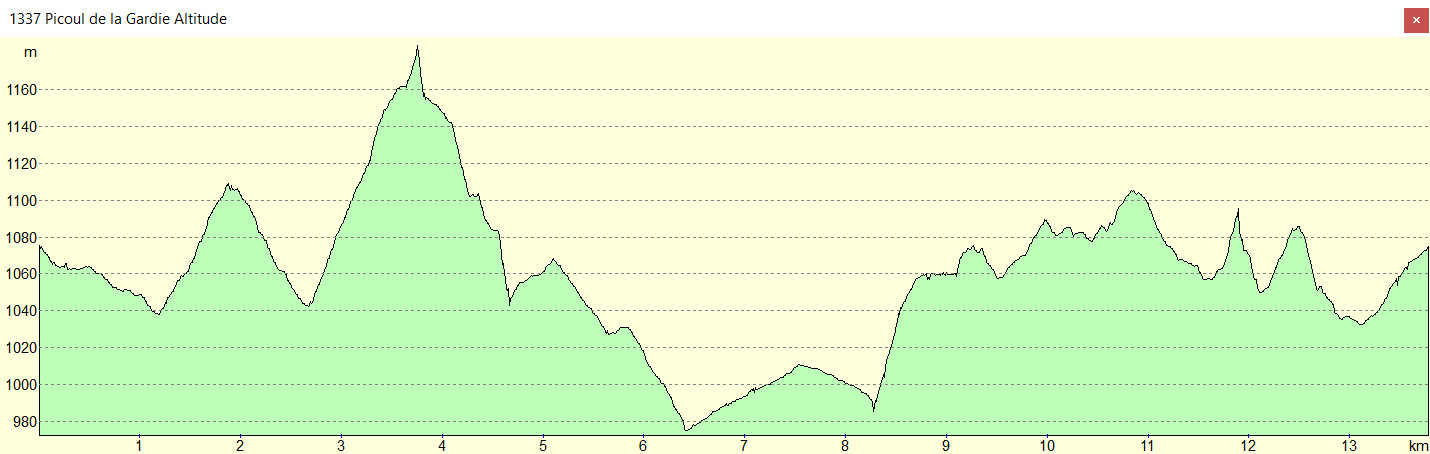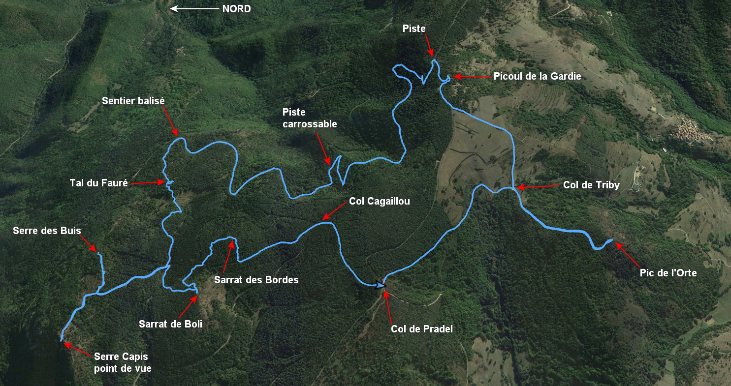 Col de Pradel 1075 m - Col de Triby 1039 m - Pic de l'Orte 1109 m - Col de Triby 1039 m - Route 1146 m - Picoul de la Gardie 1181 m - Piste 1145 m - Bac du Pradel 1060 m -
