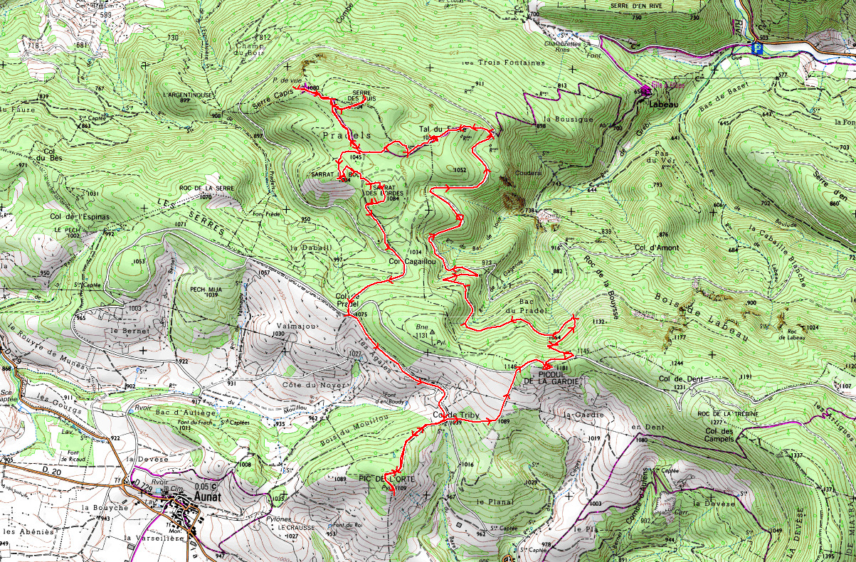 Piste carrossable 980 m - Sentier balisé 985 m - Tal du Fauré 1056 m - Serre Capis 1080 m - Serre des Buis 1104 m - Sarrat de Boli 1084 m - Sarrat des Bordes 1084 m -