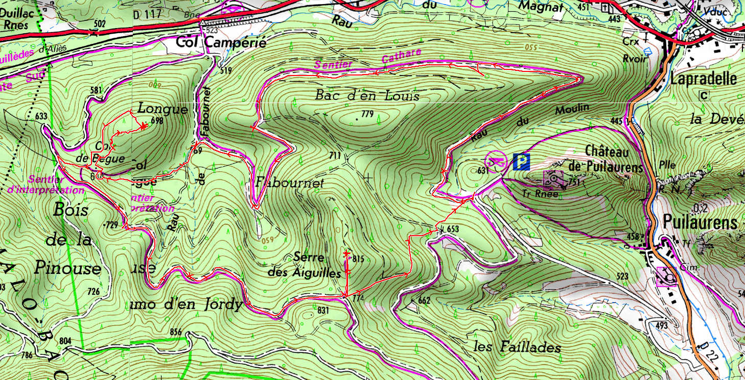 De Lapradelle sur la D117, prendre la D22 direction de Puilaurens, traverser le village puis quelques centaines de mètres après celui-ci tourner à droite vers le château de Puilaurens.