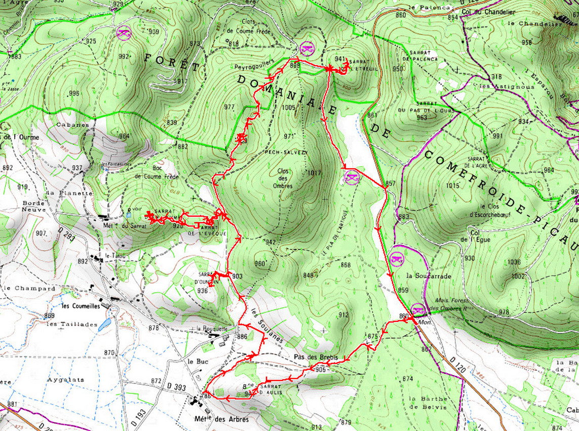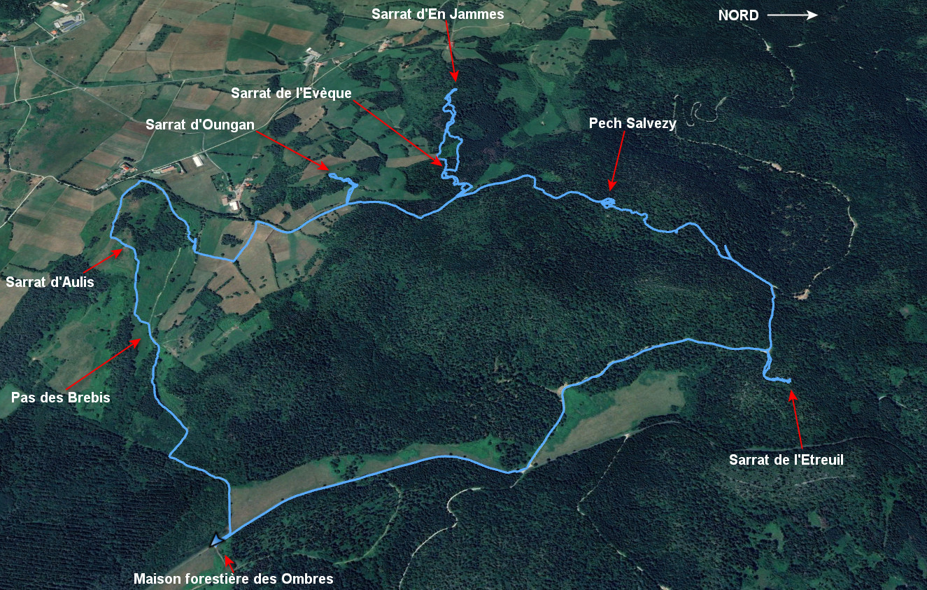 Maison forestière des Ombres 860 m - Pas des Brebis 905 m - Sarrat d’Aulis 949 m - Métairie des Arbres 884 m - Sarrat d’Oungan 936 m - Sarrat de l’Evèque 932 m - Sarrat d’En Jammes 978 m -