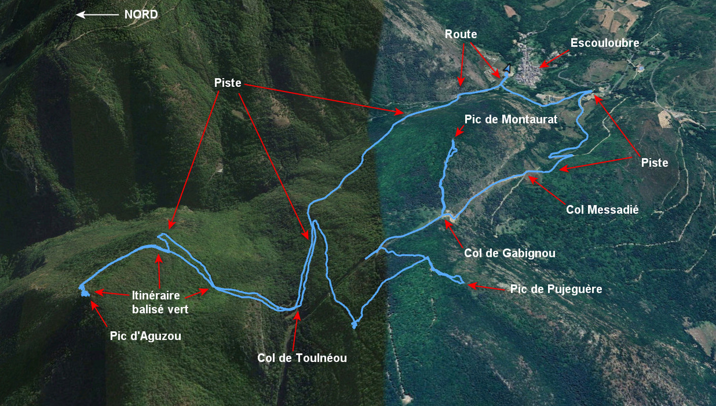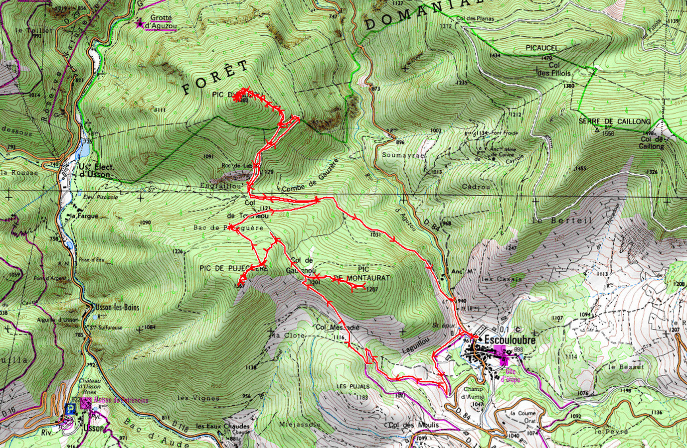 Escouloubre 950 m - Col Messadié 1116 m - Col Gabignou 1201 m - Pic de Montaurat 1267 m - Col Gabignou 1201 m - Pic de Pujeguère 1367 m -