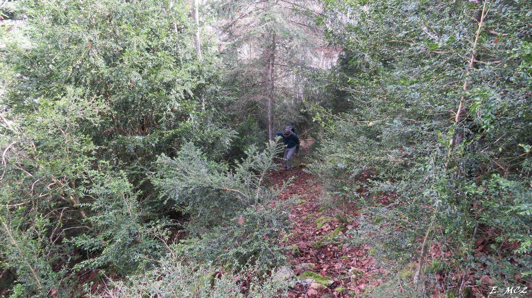 De retour au Col de Gabignou, continuer sur la piste sur environ 400 mètres et au niveau d’un poste de chasse surélevé, monter sur la gauche, direction sud-est dans du hors sentier facile dans un premier temps puis par une ancienne piste vers le Pic de Pujeguère. La piste s’arrête quelques mètres en dessous du sommet que l’on atteint sans difficulté particulière. Lors de la descente, conserver la piste jusqu’à rejoindre la piste principale un peu plus loin que l’endroit où on l’a quittée. Suivre la piste carrossable vers la gauche ou couper tout droit dans le sous-bois facile pour rejoindre la piste plus bas. A l’embranchement suivant, continuer sur la gauche jusqu’au Col de Toulnéou. Tourner à droite, faire 400 mètres environ et repérer sur la gauche de la piste au niveau d’un petit élargissement un marquage vert sombre en forme de flèche. Il marque l’amorce du cheminement permettant de monter au Pic d’Aguzou*. La première moitié de la montée est assez facile, la deuxième moitié est plus soutenue et apparemment moins parcourue. Heureusement le balisage intensif permet de s’en sortir sans trop de difficulté bien que sa couleur se noie dans la végétation par endroit, surtout sur la fin de l’ascension.