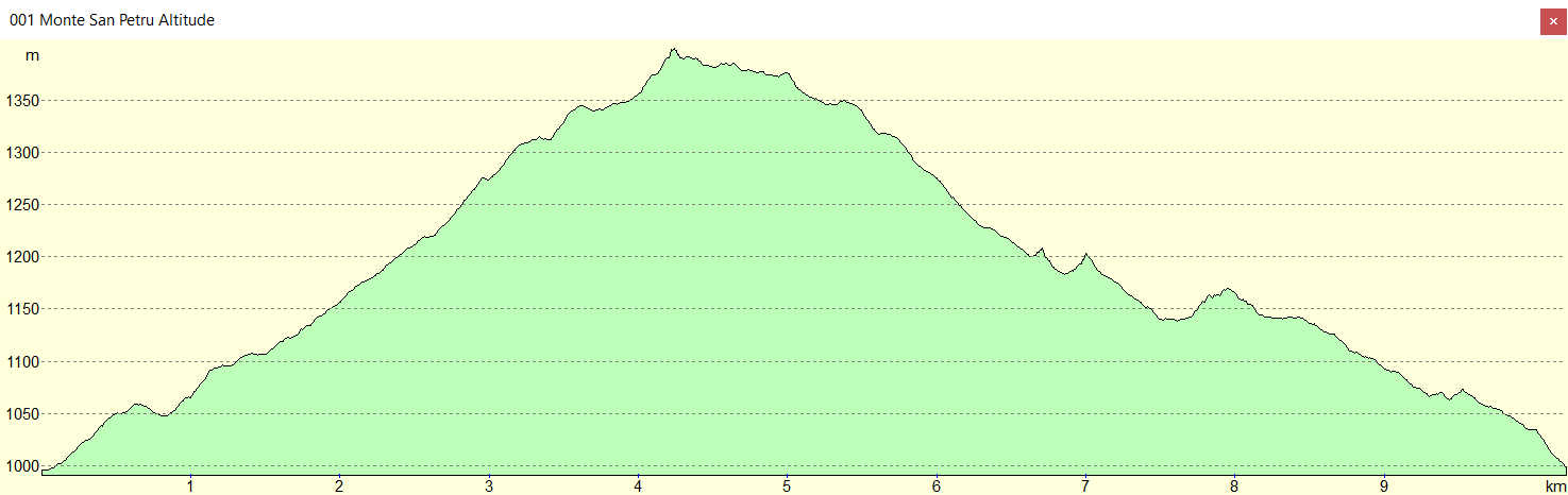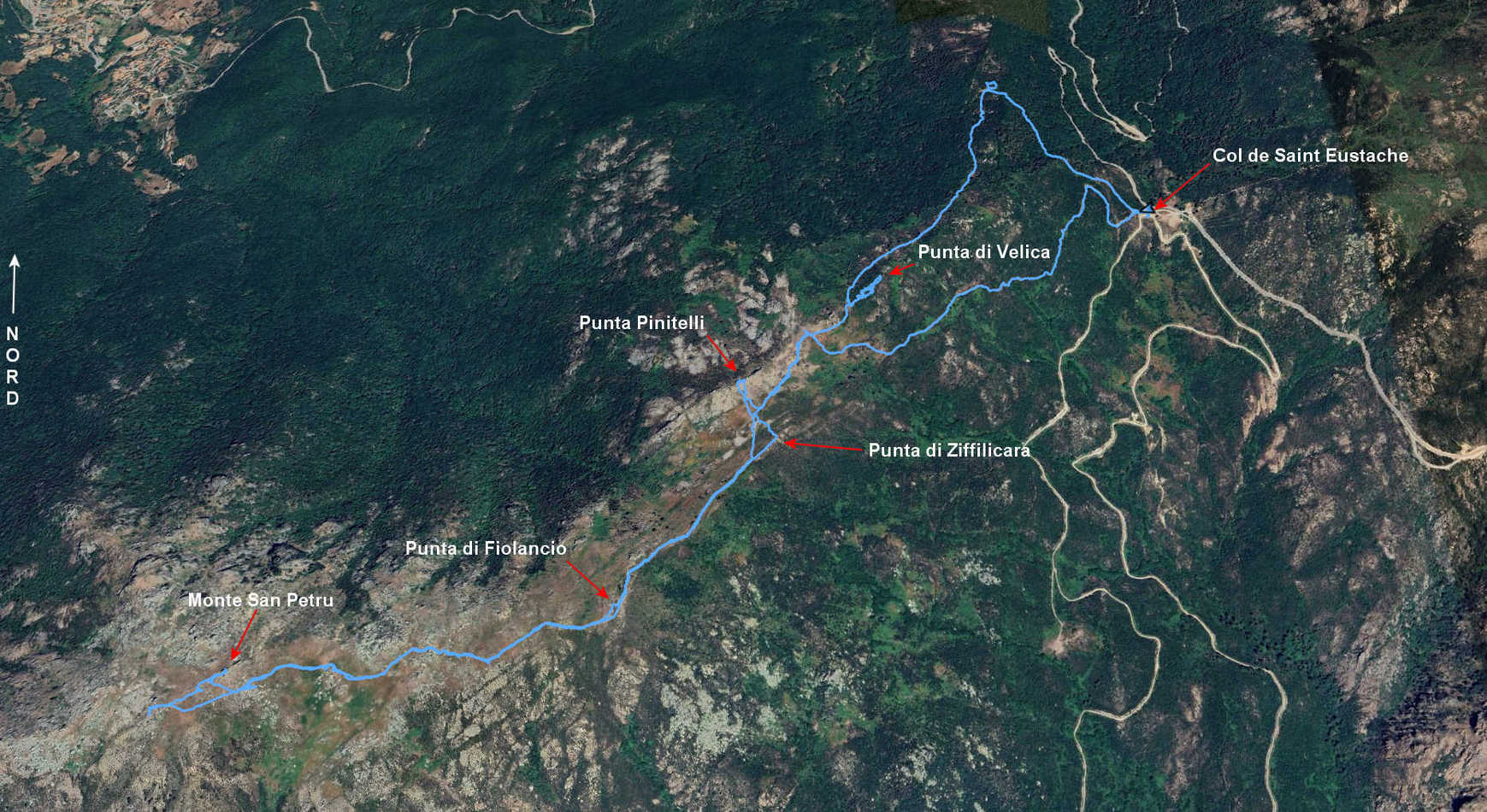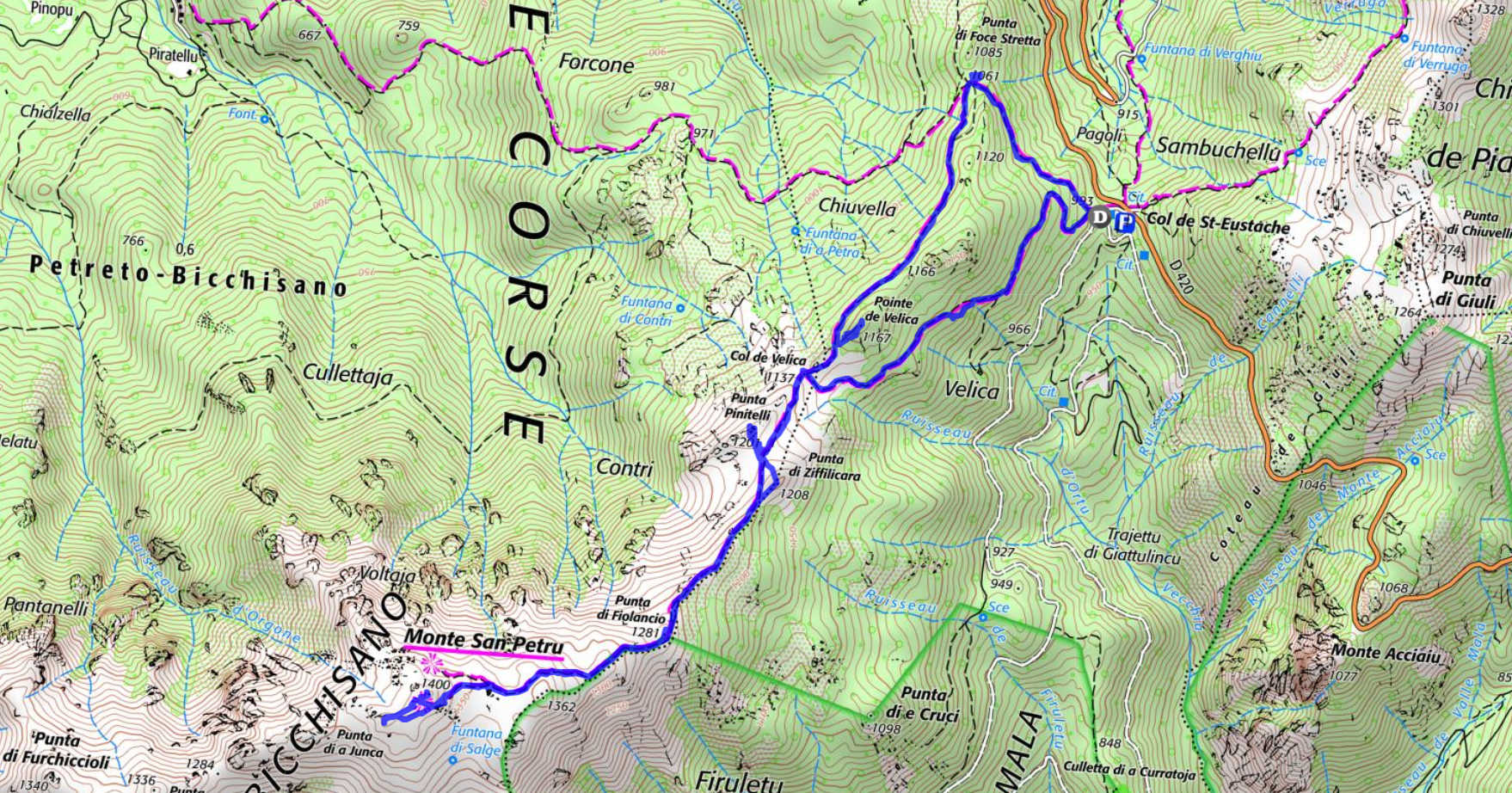 Col de Saint Eustache 993 m - Col de Velica 1137 m - Punta di Fiolancio 1281 m - Monte San Petru 1400 m - Punta di Ziffilicara 1208 m - Punta Pinitelli 1201 m - Col de Velica 1137 m -