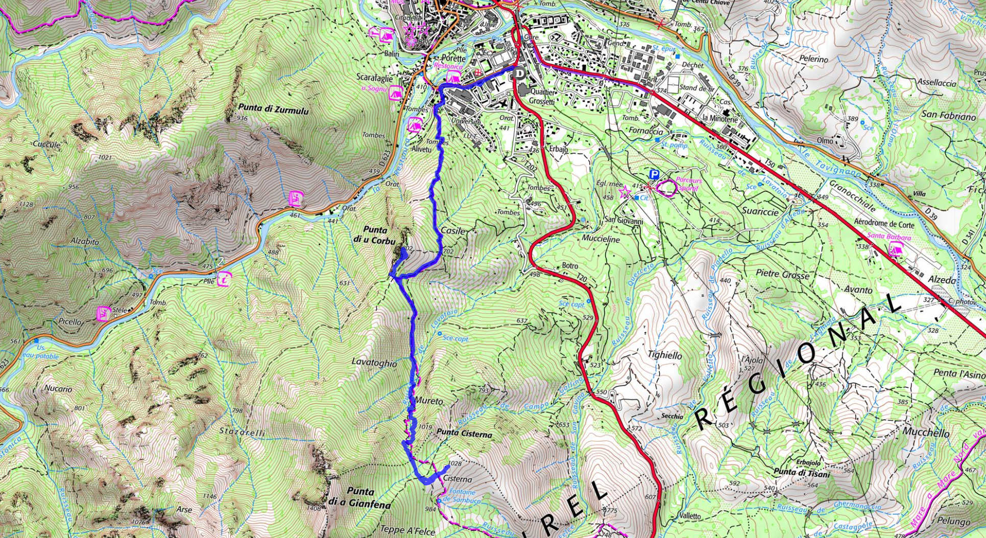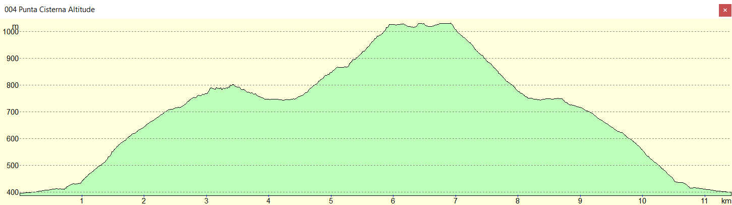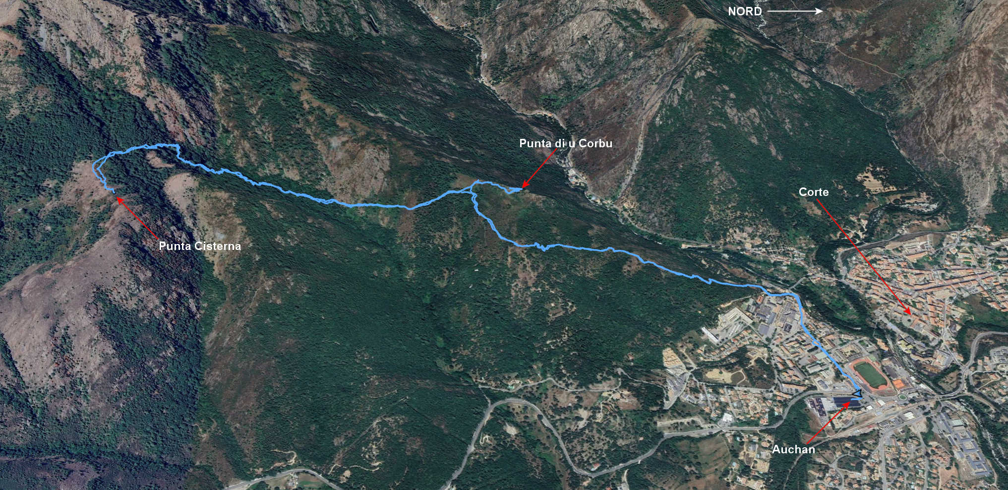 Corte 400 m - Col 750 m - Punta di u Corbu 802 m - Punta Cisterna 1028 m - Corte 400 m