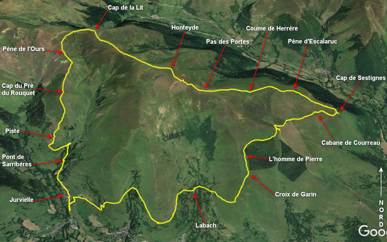 Pène de l'Ours 1919 m - Cap du Pré de Rouquet 1173 m - Piste 1480 m - Pont de Sarribères 1340 m - Jurvielle 1270 m