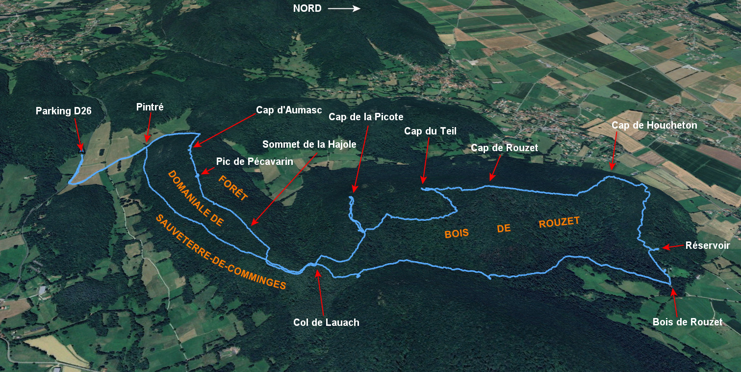 Parking D26 480 m - Piste 488 m - Pintré 490 m - Col de Lauach 581 m - La Picotte 460 m - Bois de Rouzet 426 m - Cap de Houcheton 599 m - Col 536 m - Cap de Rouzet 681 m - Col 672 m -
