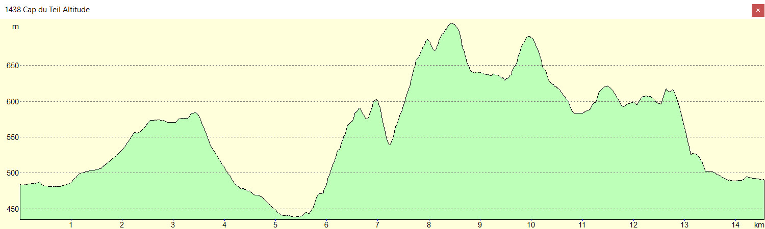 Cap du Teil 707 m - Sentier 643 m - Bifurcation 634 m - Cap de la Picote 682 m - Col de Lauach 581 m - Bifurcation 573 m - Sommet de la Hajole 608 m -