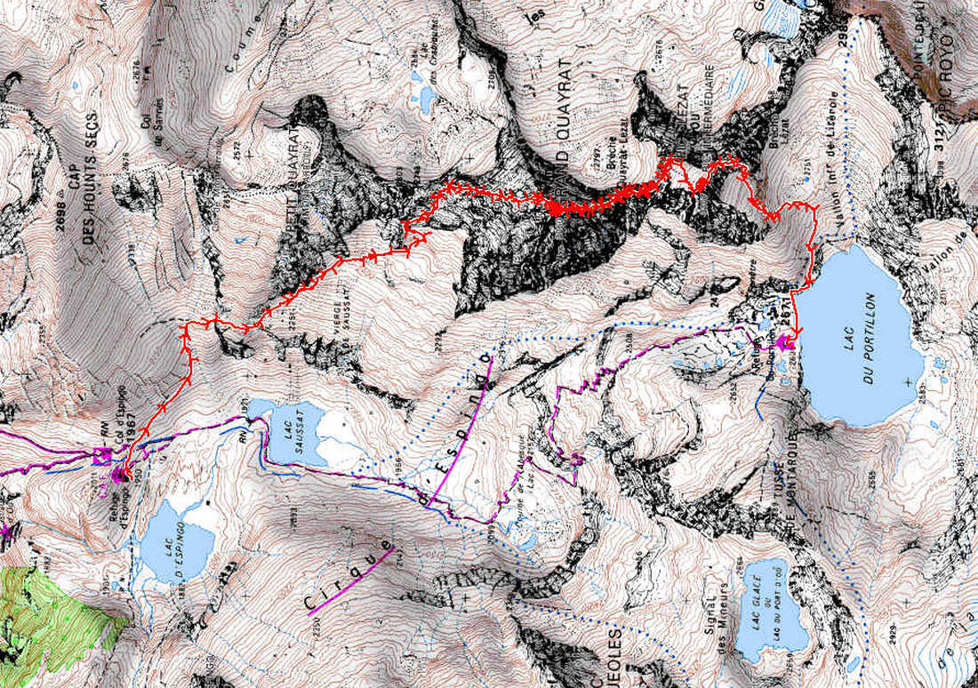 J2 : Refuge d'Espingo 1950 m - Arête nord 2760 m - Sommet nord 3046 m - Grand Quayrat 3060 m - Brèche Quayrat-Lézat 2900 m - Pic lézat 3107 m - Refuge Jean Arlaud 2548 m