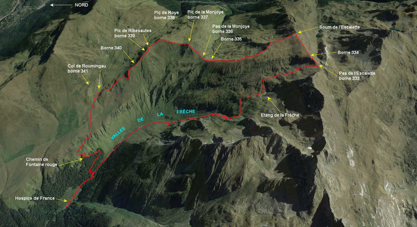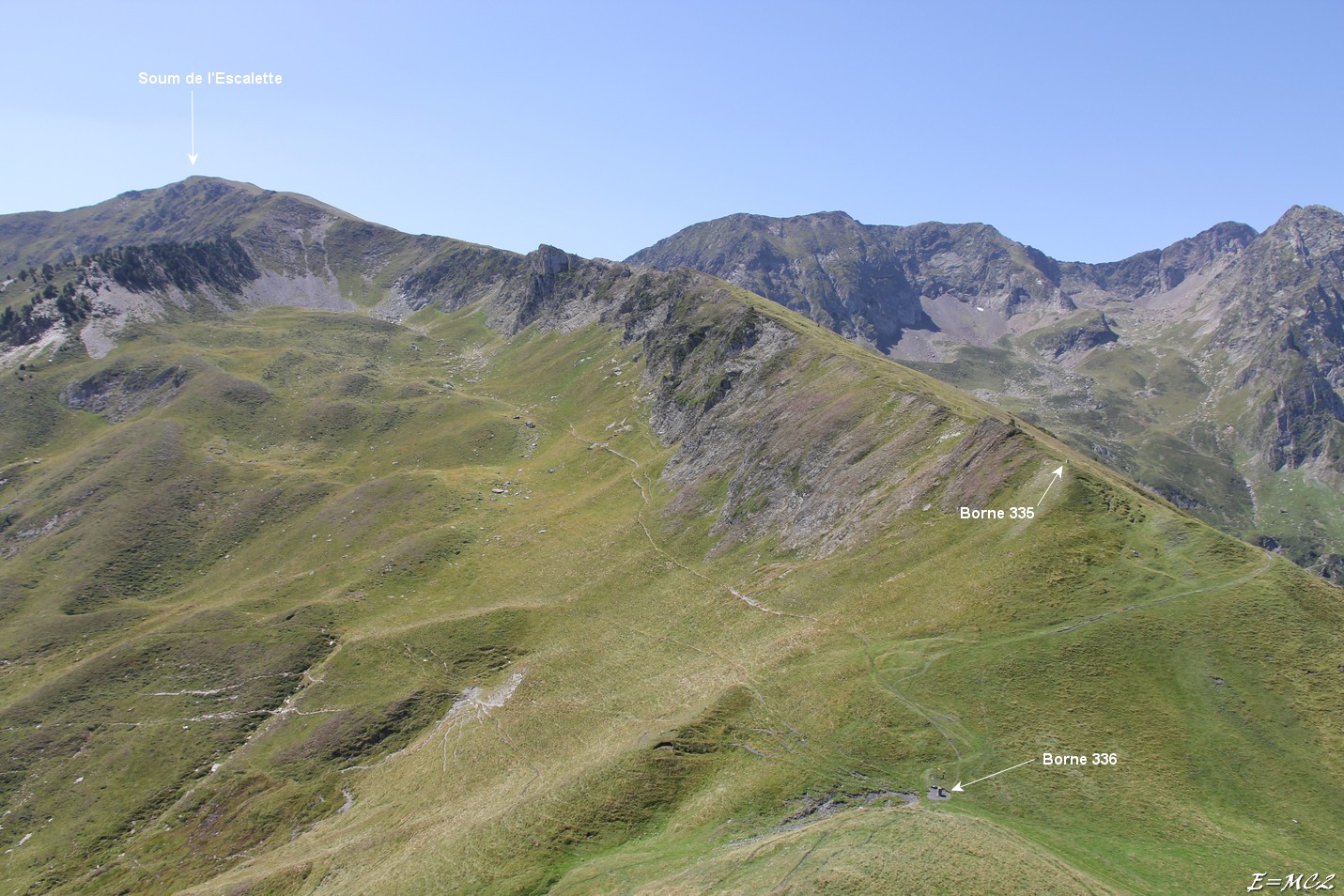 De l’Hospice de France, prendre la direction de la Vallée de la Frêche et la remonter jusqu’au Pas de l’Escalette où on trouve la borne frontière 333. Suivre la crête frontière vers l’est jusqu’au Soum de l’Escalette, on trouve la borne 334 à peu de distance du Pas de l’Escalette.