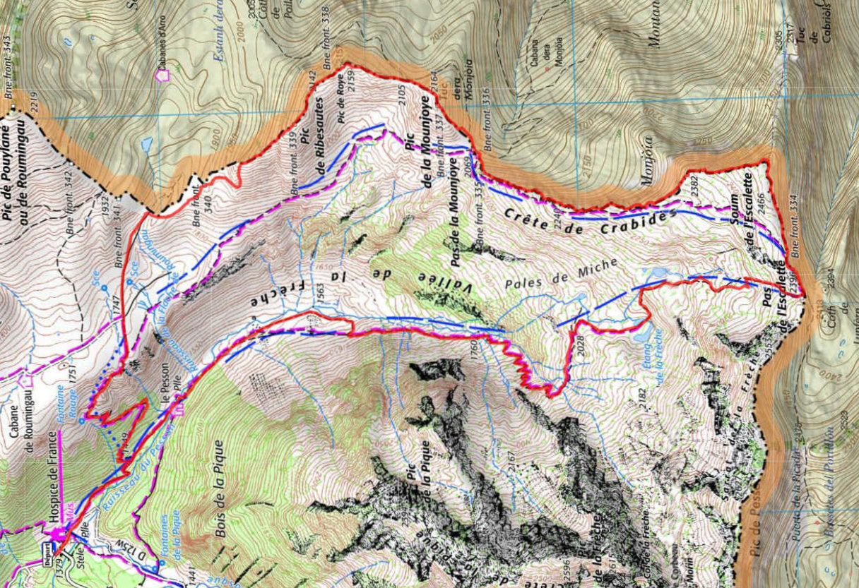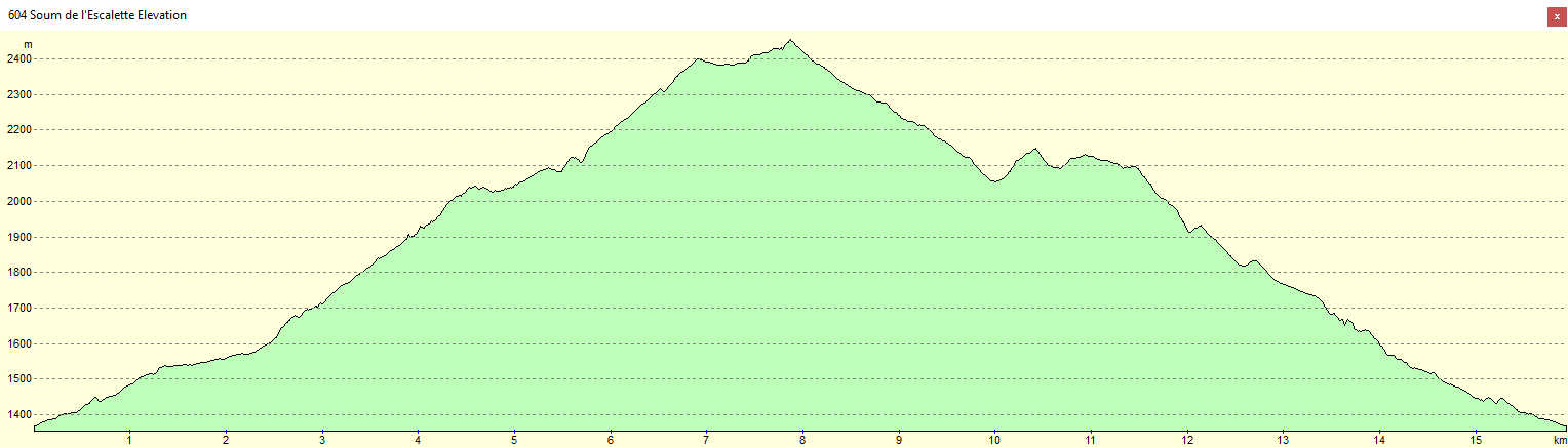 Hospice de France 1375 m - Etang de la Frêche 2100 m - Pas de l'Escalette 2396 m - Soum de l'Escalette 2466 m - Pas de la Mounjoye 2069 m - Pic de la Mounjoye 2170 m -