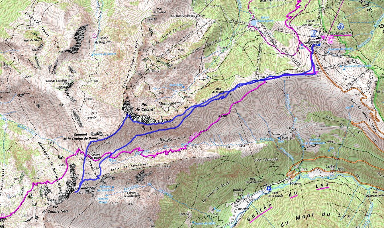 Superbagnères 1800 m - Mail de la Tute 1923 m - Pic de Céciré 2403 m - Col 2311 m - Sommet de la Coume de Bourg 2367 m - Col de la Coume de Bourg 2272 m -