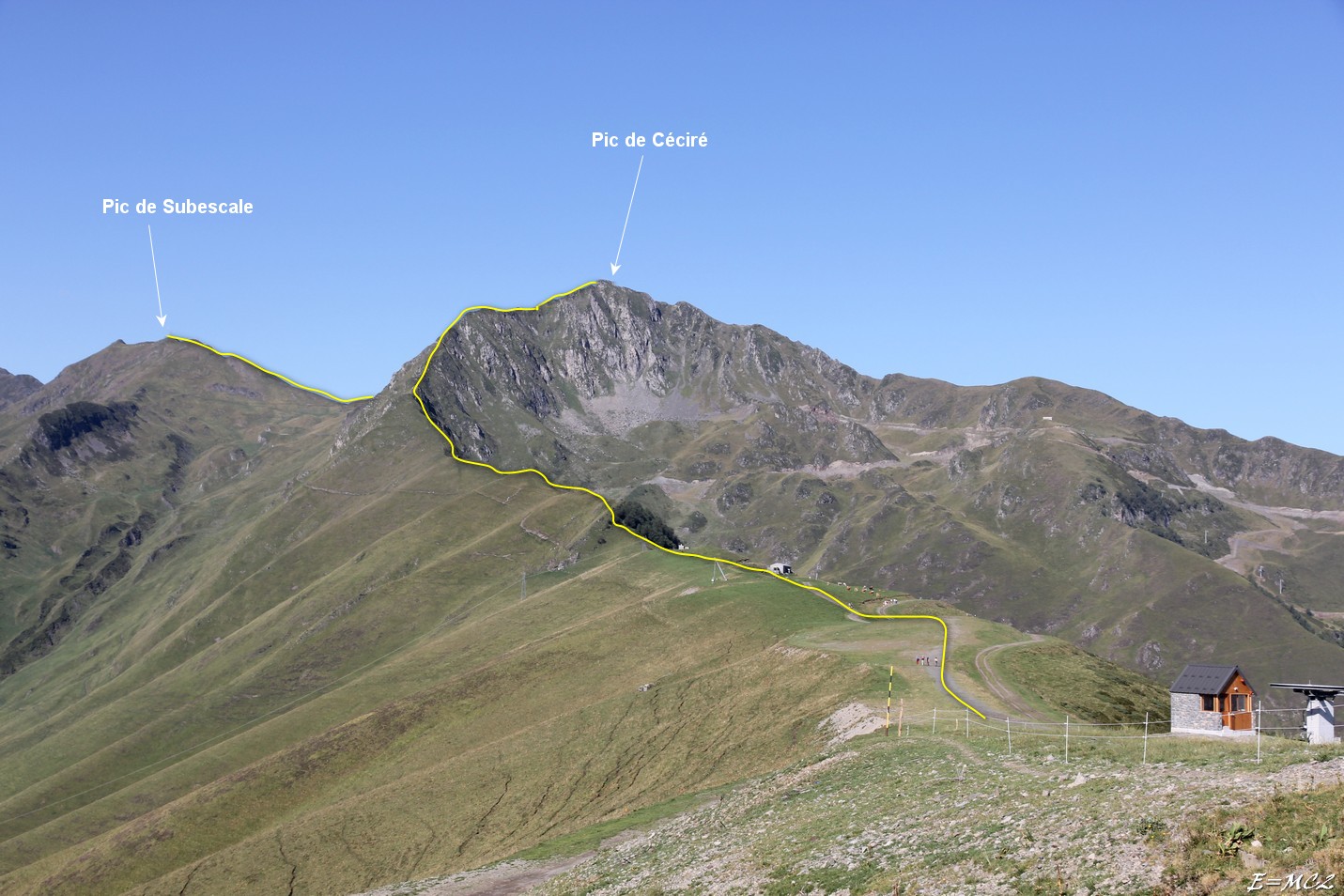 Du Pic de Céciré continuer sur la crête vers le sud-ouest, monter au sommet de la Coume de Bourg, obliquer au sud, descendre au col et continuer tout droit jusqu’au Pic de Subescale.