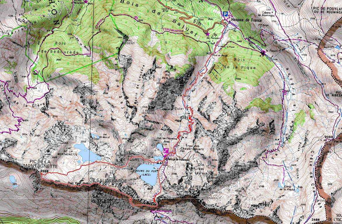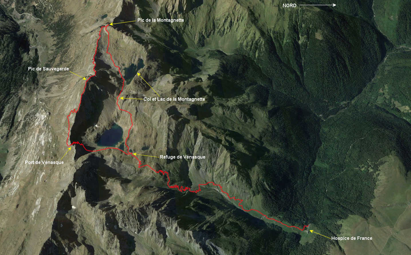 Hospice de France 1385 m - Refuge de Vénasque 2248 m - Col de la Montagnette 2421 m - Lac de la Montagnette 2340 m - Pic de la Montagnette 2558 m - Port Vieilh 2468 m -