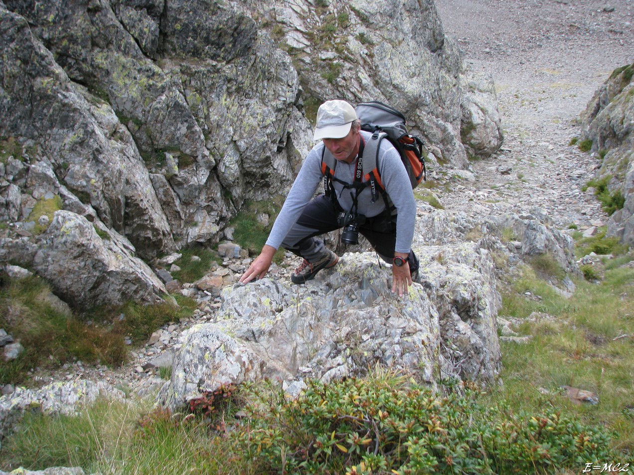 Pour ne pas rester sans rien faire, nous avons rejoint le Pas de l’Escalette en passant par le Col de la Frèche. Pour cela, commencer à descendre vers l’Hospice de France. A la suite des premiers virages, prendre le sentier sur la droite, il conduit en 4 ou 5 virages au Clot des Layrous. Remonter le vallon sur la gauche de son thalweg, la pente se redresse progressivement pour finir dans un pierrier assez raide et une cheminée étroite donne accès au Col de la Frèche. La descente sur l’autre versant est un peu moins raide. La solution la plus simple est de descendre aux Etangs de la Frèche mais il est possible en perdant moins d’altitude de rejoindre le sentier du Pas de l’Escalette.