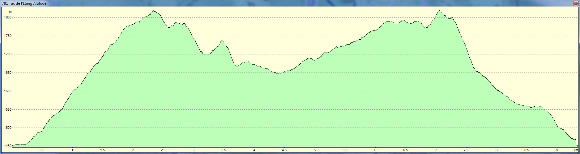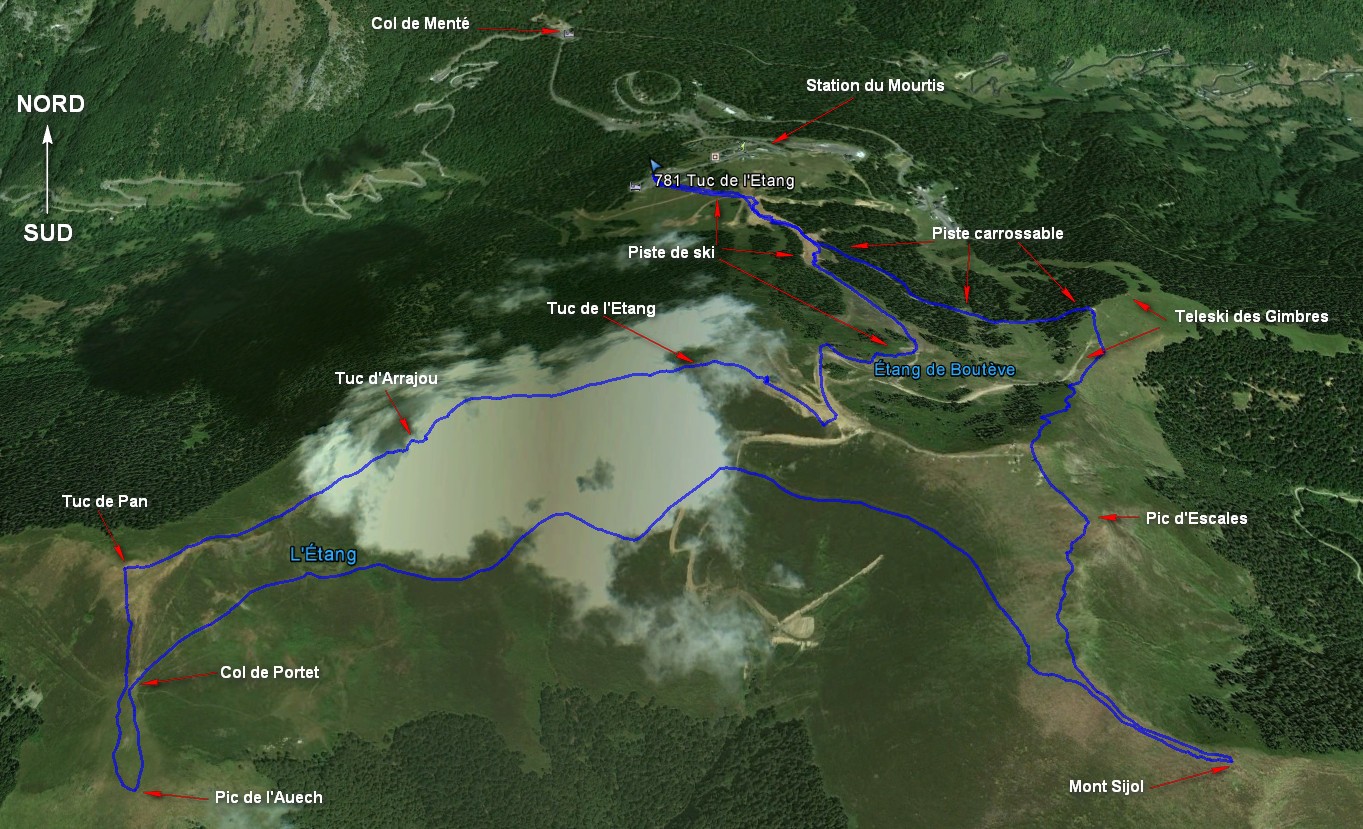 Station du Mourtis 1453 m - Tuc de l'Etang 1816 m - Col 1171 m - Tuc d'Arrajou 1781 m - Col 1692 m - Tuc de Pan 1734 m - Col de Portet 1659 m - Pic de l'Auech 1671 m - Col de Portet 1659 m - Mont Sijol 1790 m - Mont Mouchon 1787 m - Col 1770 m - Pic d'Escales 1816 m - Station du Mourtis 1453 m