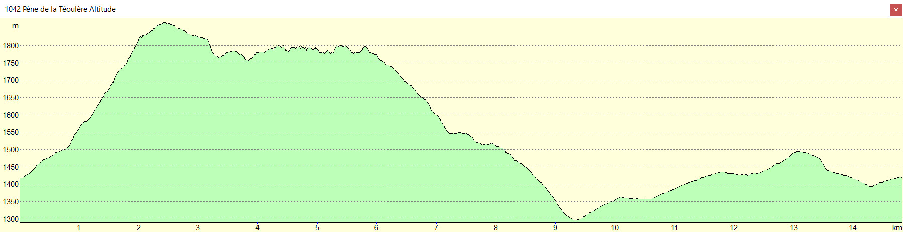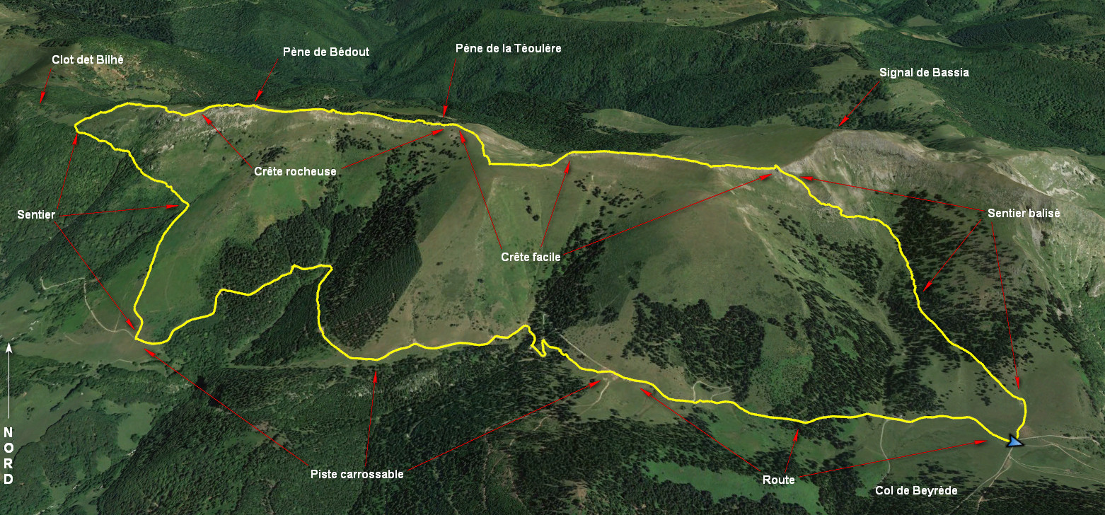 Col de Beyrède 1417 m - Col 1826 m - Pène de la Téoulère 1800 m - Pène de Bédout 1798 m - Piste 1280 m - Ribe de la Poutge 1494 m - Col de Beyrède 1417 m