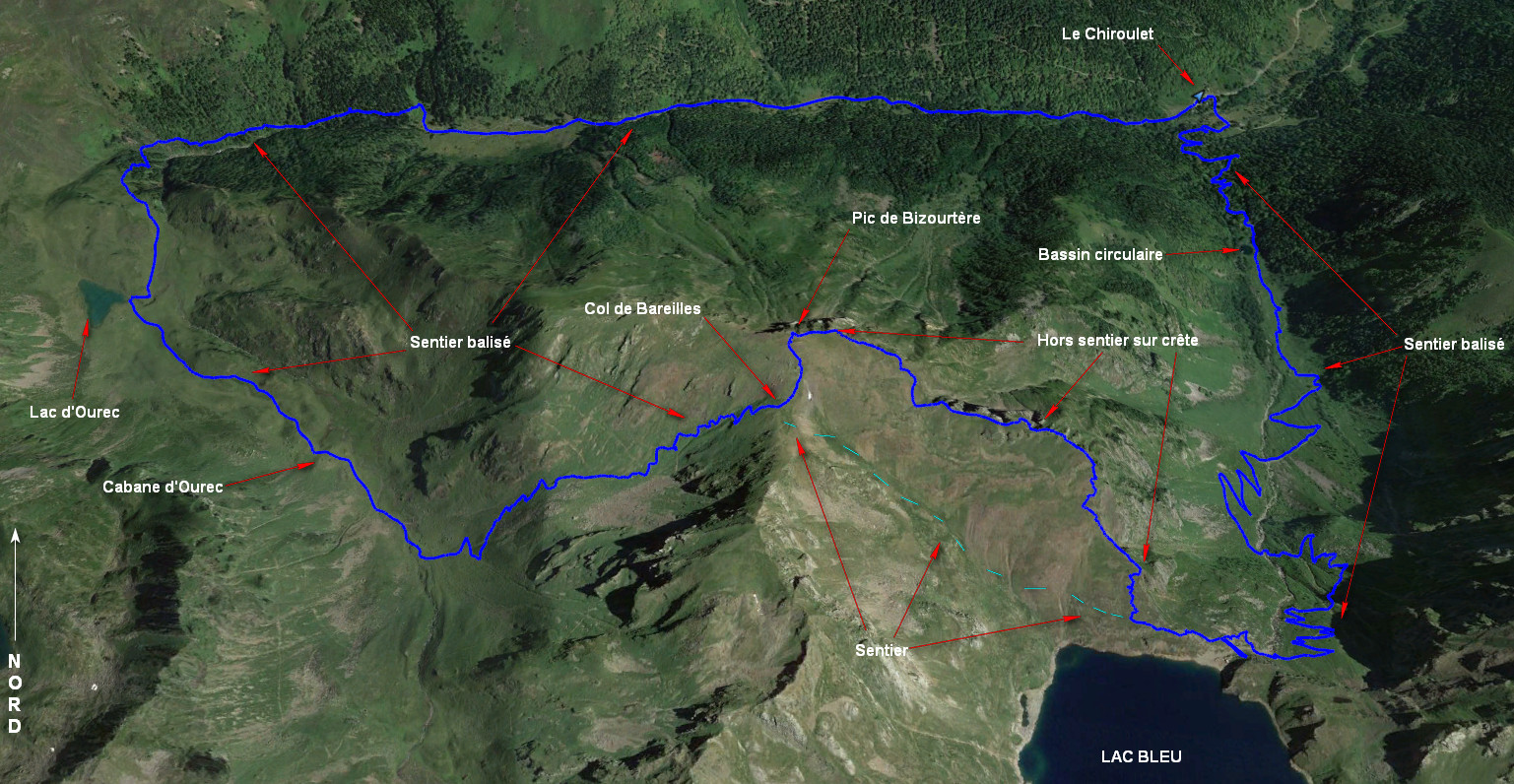 Le Chiroulet 1062 m - Lac Bleu 1968 m - Pic de Bizourtère 2311 m - Col de Bareilles 2238 m - Cabane d'Ourec 1760 m - Lac d'Ourec 1667 m - Le Chiroulet 1062 m
