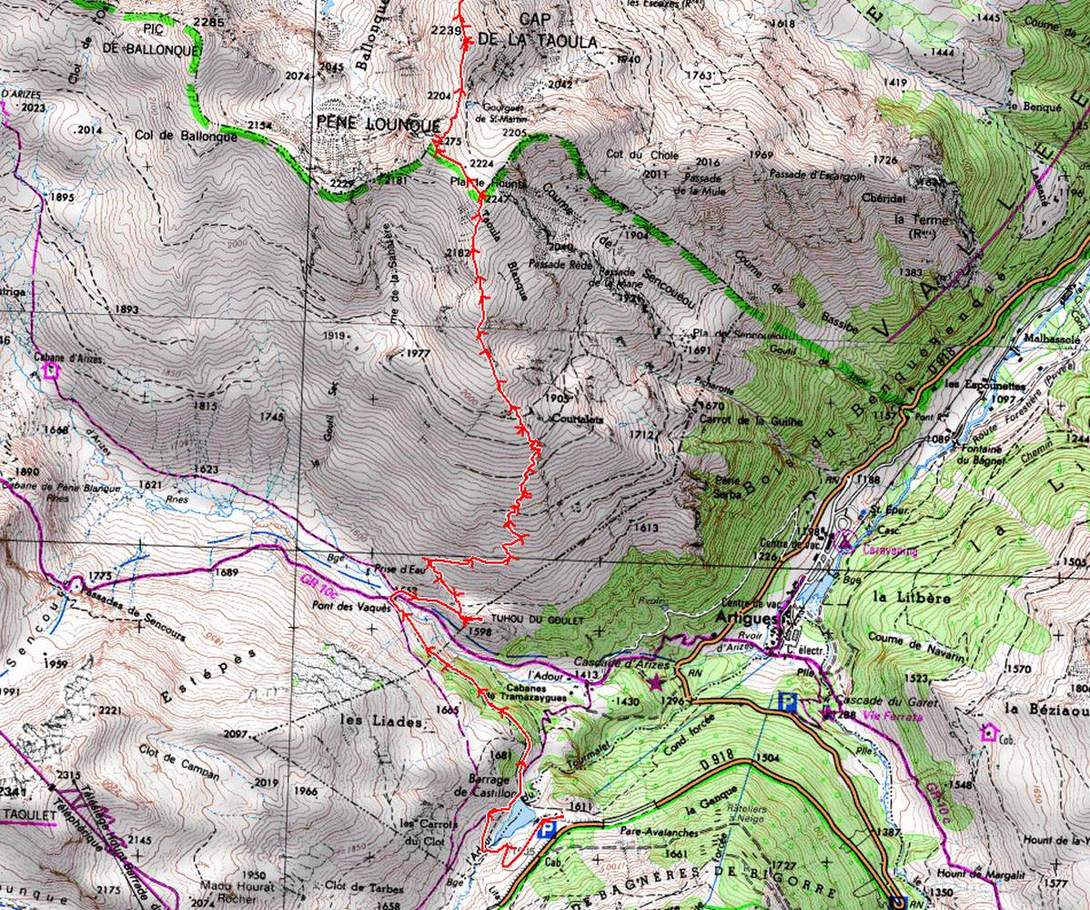 La Mongie parking inférieur 1580 m - Barrage de Castillon 1550 m - Pont des Vaquès 1552 m - Tuhou du Goulet 1598 m - Pla de Hounta 2247 m - Col 2224 m - Pène Lounque 2275 m - Col 2204 m - Cap de la Taoulat 2269 m -