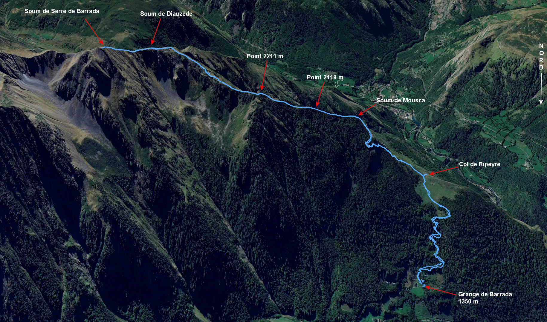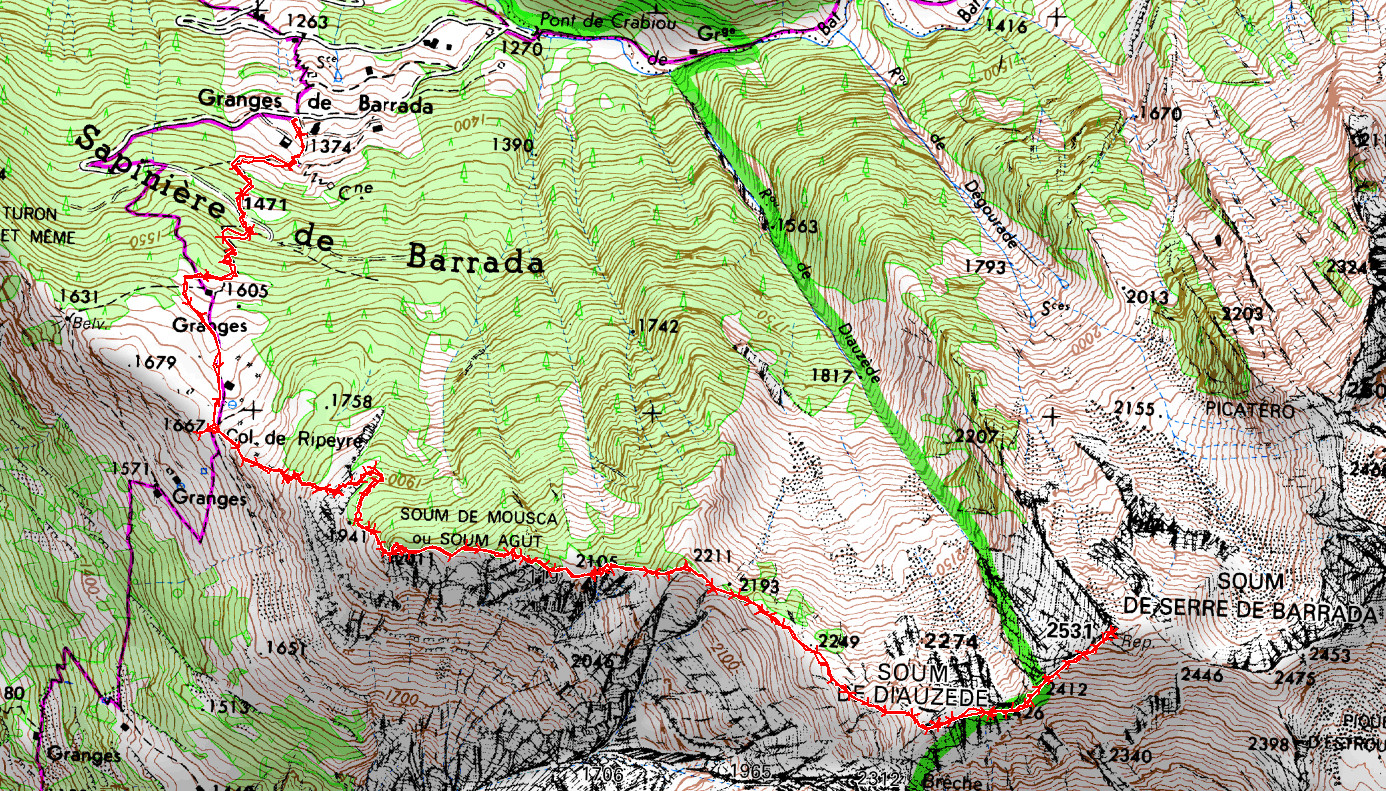 Granges de Barrada 1350 m - Col de Ripeyre 1667 m - Soum de Mousca 2011 m - Point 2119 m - Point 2211 m - Soum de Diauzède 2426 m - Col 2412 m -